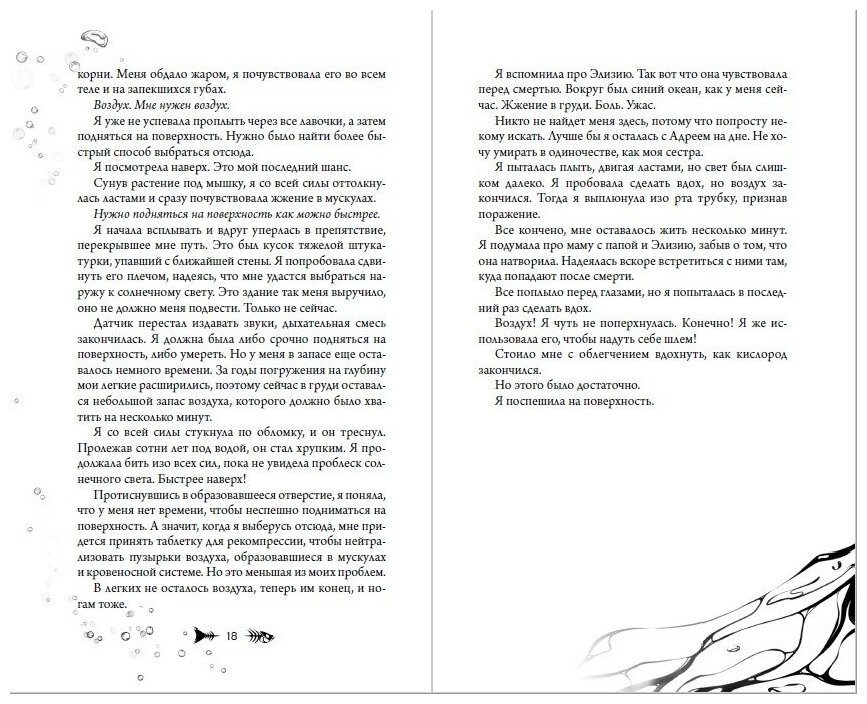 Внутри есть рисовка от автора - как она представляет себе четырех главных героев - Темпе, Элизию, Лора и Рэйлана. Во-вторых, сам сюжет и герои. Для любителей морской тематики, тайны океанов, пост-апокалипсиса и темы «человечности и жизни после смерти» она прекрасно подойдет.