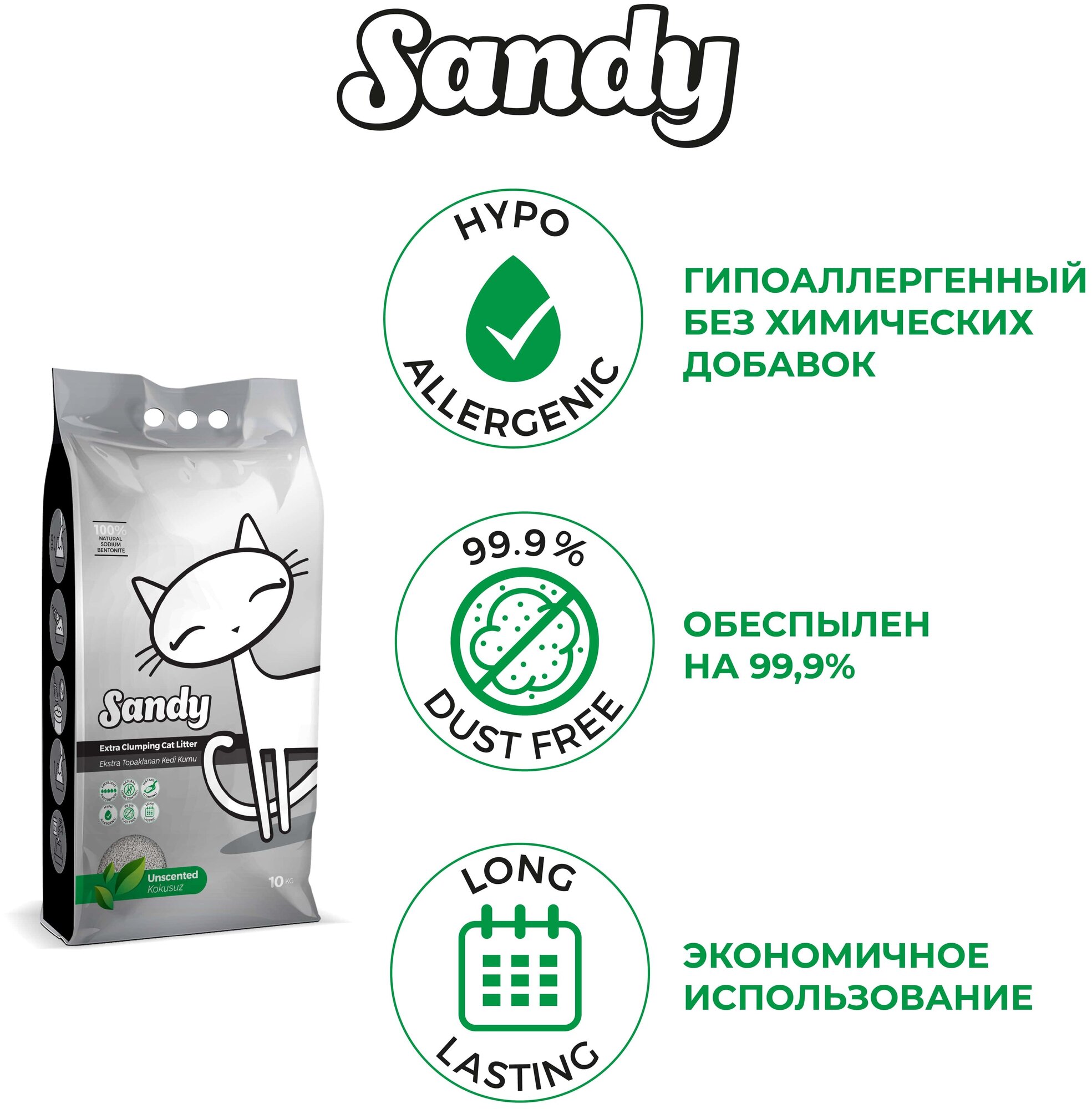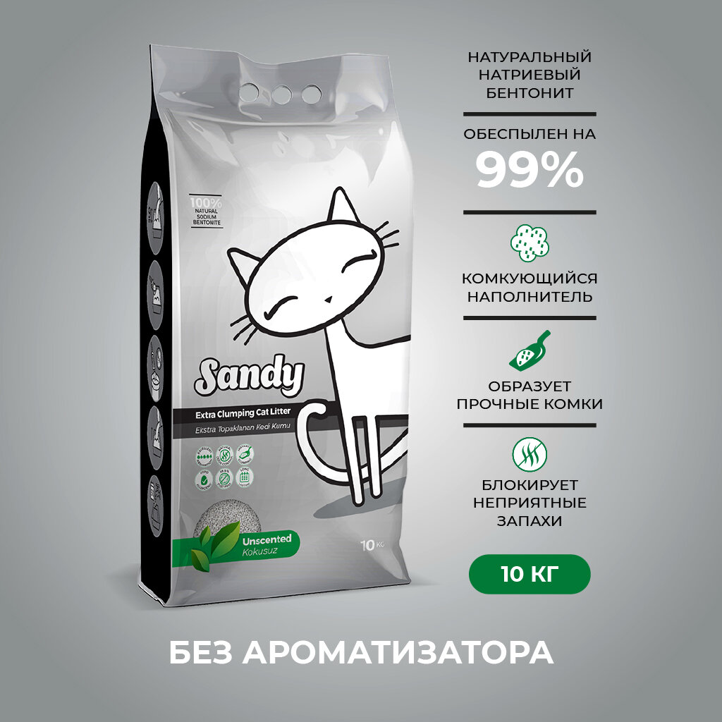 Sandy® – это суперпремиальный экстракомкующийся наполнитель из 100% натурального высококачественного натриевого бентонита. Серый натриевый бентонит обладает природными свойствами поглощать и надежно блокировать неприятные запахи. При правильном ежедневном использовании наполнителя Sandy® , нет необходимости применять освежители воздуха или другие маскирующие запах средства. Гранулы натриевой глины приятны для кошачьих лапок, а её благородный серый цвет дает кошкам естественное чувство комфорта, побуждая их пользоваться лотком. Sandy® гипоаллергенен, не содержит химических добавок. Не имеет ароматизаторов в составе и естественным образом поглощает неприятные запахи и блокирует пары аммиака. Sandy® мгновенно образует экстрапрочные комки и имеет высокую абсорбирующую способность. Обеспылен на 99,9%.