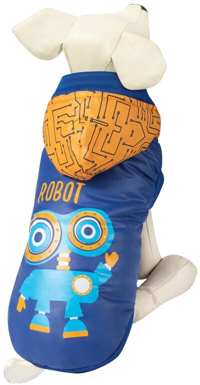 Утепленная попона "Робот" с капюшоном для комфортных прогулок даже в самую ненастную погоду. Попона украшена оригинальным принтом на спине. Застегивается при помощи трех заклепок на животе. Подкладка: флис.