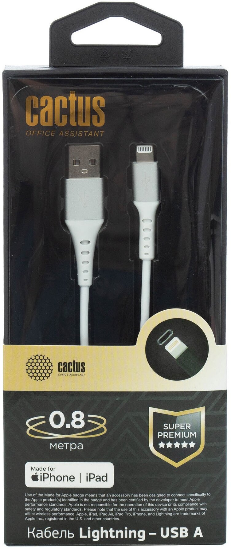 Кабель Cactus белый, коннекторы USB (m)-Lightning (m), длина 0.8м, (CS-LG.USB.A-0.8)