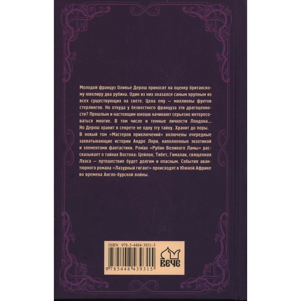 В новый том "Мастеров приключений" включены очередные захватывающие истории Андре Лори, наполненные экзотикой и элементами фантастики. Роман "Рубин Великого Ламы" рассказывает о тайнах Востока: Цейлон, Тибет, Гималаи, священная Лхаса - путешествие будет долгим и опасным. События авантюрного романа "Лазурный гигант" происходят в Южной Африке во времена Англо-бурской войны.