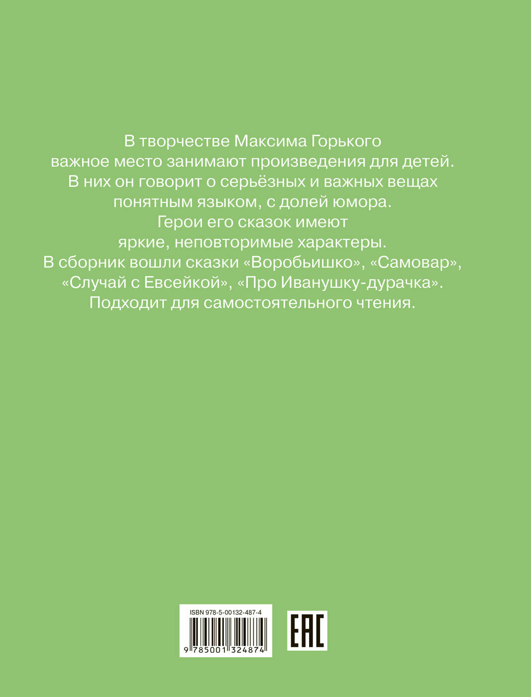 В творчестве Максима Горького важное место занимают произведения для детей. В них он говорит о серьёзных и важных вещах понятным языком, с долей юмора. Герои его сказок имеют яркие, неповторимые характеры. В сборник вошли сказки "Воробьишко", "Самовар", "Случай с Евсейкой", "Про Иванушку-дурачка". Подходит для самостоятельного чтения.