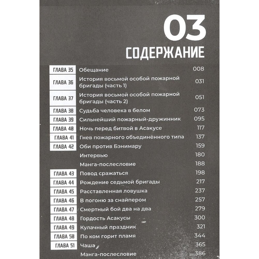 Манга пламенной бригады заинтересовала меня идеей,стилем,персонажами и создателем,который кроме пламенной бригады,также создал великолепное произведение-soul eater.В 3 томе пламенной бригады заметно улучшилась рисовка по сравнению с другими томами.Сюжет так же набирает обороты,и читатель вместе с героями встречает множество калоритных персонажей