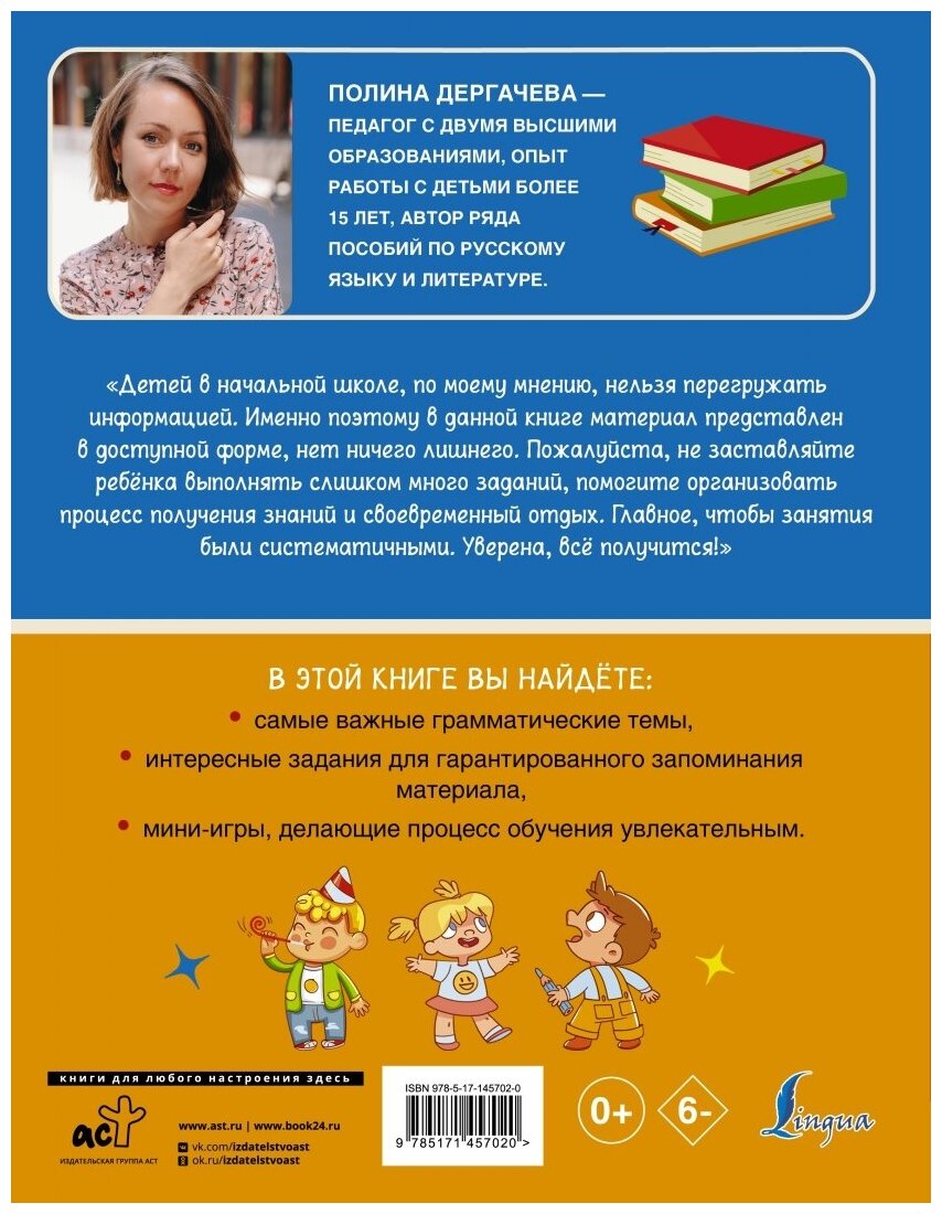 Полина Дергачева - преподаватель русского языка с опытом работы более 15 лет, автор ряда пособий по русскому языку и литературе. Автор считает, что материал для детей необходимо преподносить в доступной форме, и придерживается этого принципа при составлении своих книг.