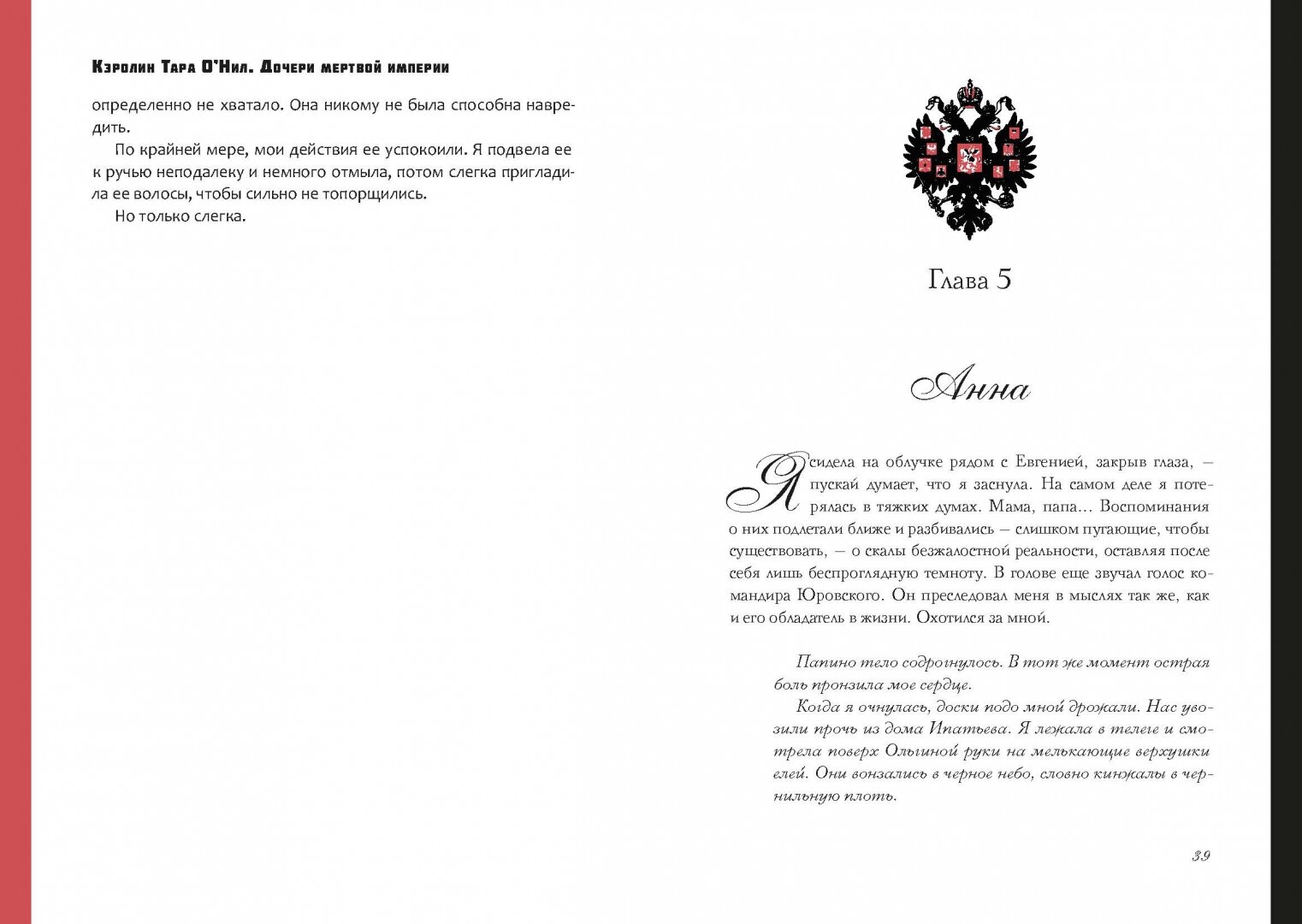 -  Борунова Екатерина- 23 апреля 20235/5 Первое что хотелось бы отметить: прекрасное оформление книги! Повествование ведется от лица двух главных героинь и каждая глава оформлена им под стать. Читать от этого было вдвойне приятнее). Книга меня заинтересовала прежде всего тем, что в ней повествуется о чудом спасшейся дочери последнего российского императора - княжне Анастасии. Перевод хороший, текст легко читается, сюжет понравился!