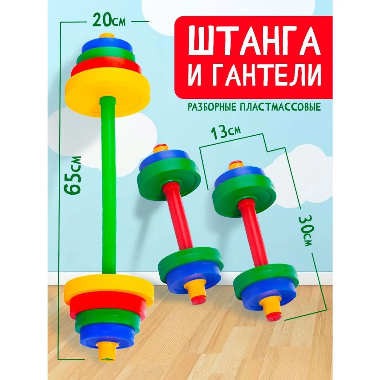 Набор юного спортсмена и активного малыша. Штанга и гантели помогут ребенку стать сильнее и выносливее, а также с ранних лет привьют любовь к спорту. Яркие цвета и легкие, практичные материалы позволят заниматься будущим чемпионам в любой обстановке.