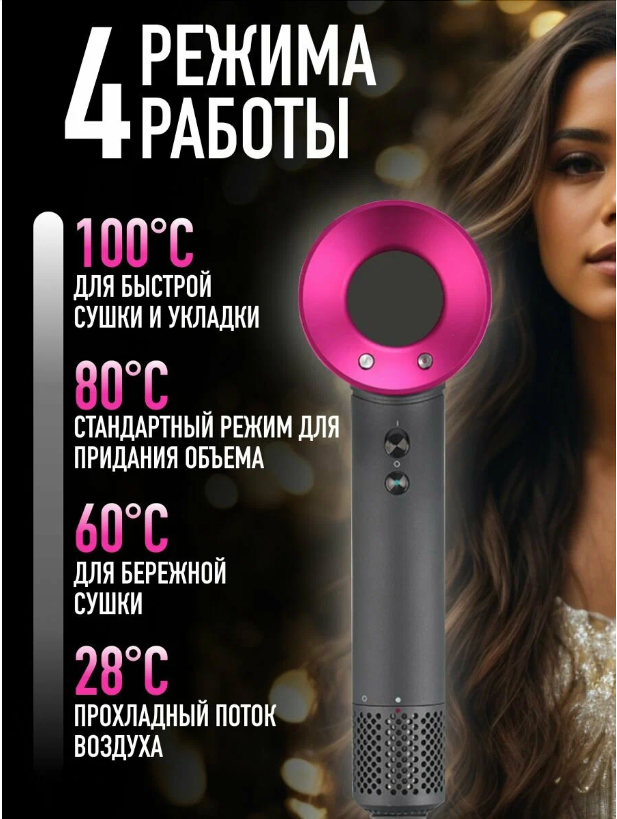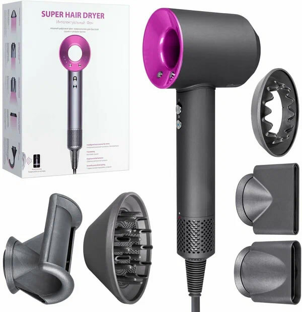 Фен для волос - совершенно новый подход к сушке и укладке волос. Фен практически бесшумен. Благодаря мощному потоку воздуха, высушить волосы теперь не отнимет много времени. Инновационная конструкция фена находится не в корпусе, а в ручке. Это позволяет перераспределить и усилить поток воздуха до скорости 41 л/сек. Три режима скорости и температура от 28 до 100 градусов позволят подобрать настройки для идеальной укладки любого типа волос. Функция ионизации добавляет в поток воздуха множество отрицательно заряженных ионов, благодаря чему волосы становятся гладкими, эластичными, легко поддаются укладке и дольше держат форму. В комплектацию входит насадка для укладки волос и подставка держатель, а длина кабеля составляет 1.8 метра.Электродвигатель 1600 ВтФен обладает мощностью 1600 Вт и мягко воздействует на волосы. Благодаря современной конструкции, поток воздуха достигает скорости 41 л/сек, что позволяет высушить волосы всего за пару минут.3 режима работыФен поддерживает 3 режима работы. Благодаря этому вы сможете настроить оптимальную температуру потока воздуха для максимально комфортного использования устройства.Ионизация воздухаУстройство оснащено ионизатором потока воздуха. Объемный поток ионизированного воздуха запирает влагу внутри волос и делает их блестящими и шелковистыми, защищает от статического электричества и предотвращает сечение кончиков.