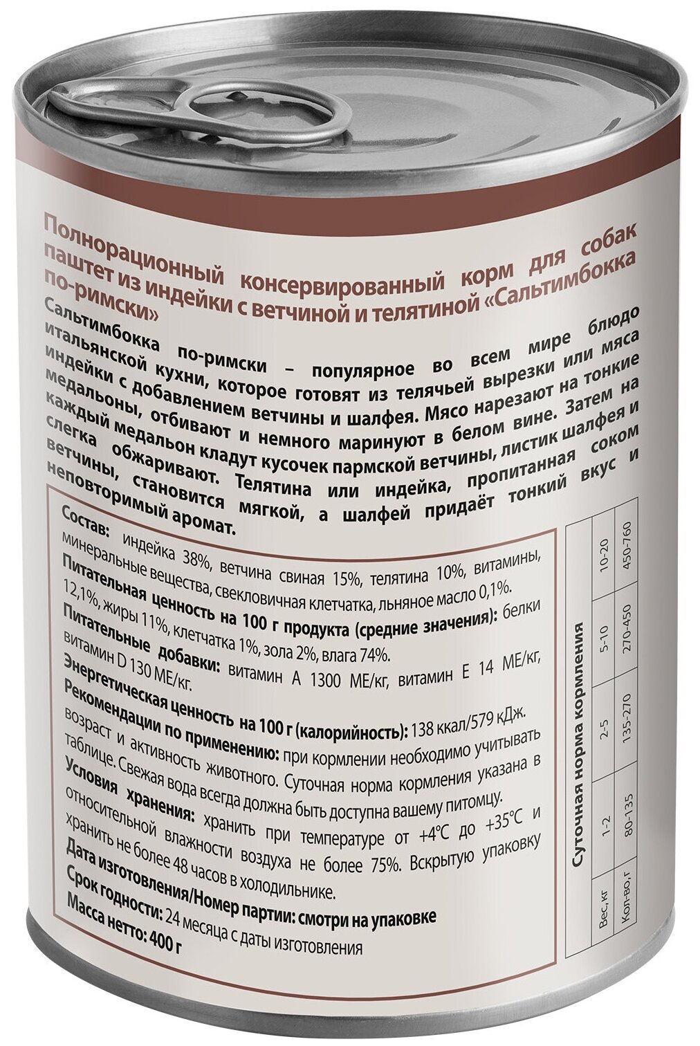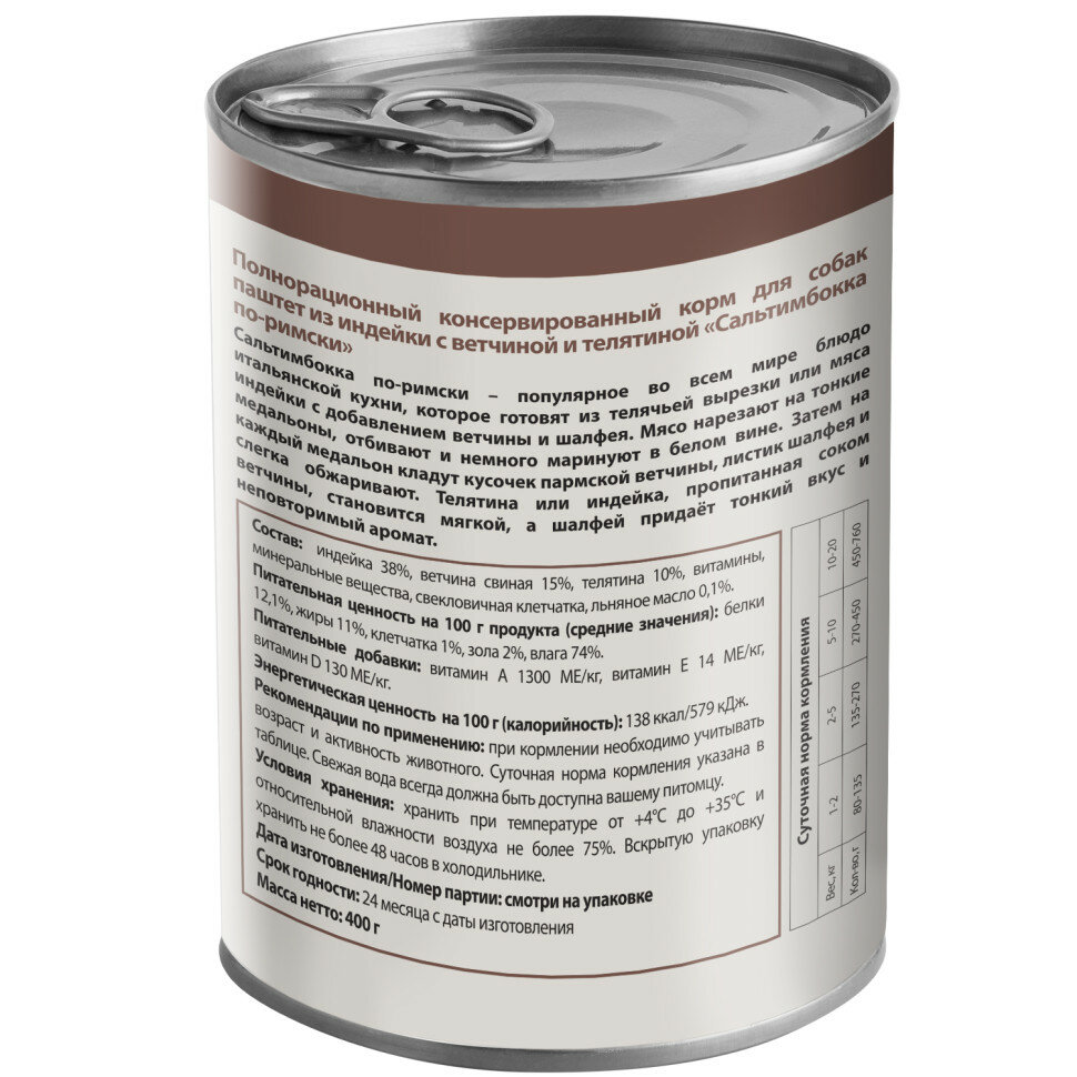 "Полнорационный консервированный корм для собак ""Сальтимбокка по-римски"". Паштет из индейки с ветчиной и телятиной.
