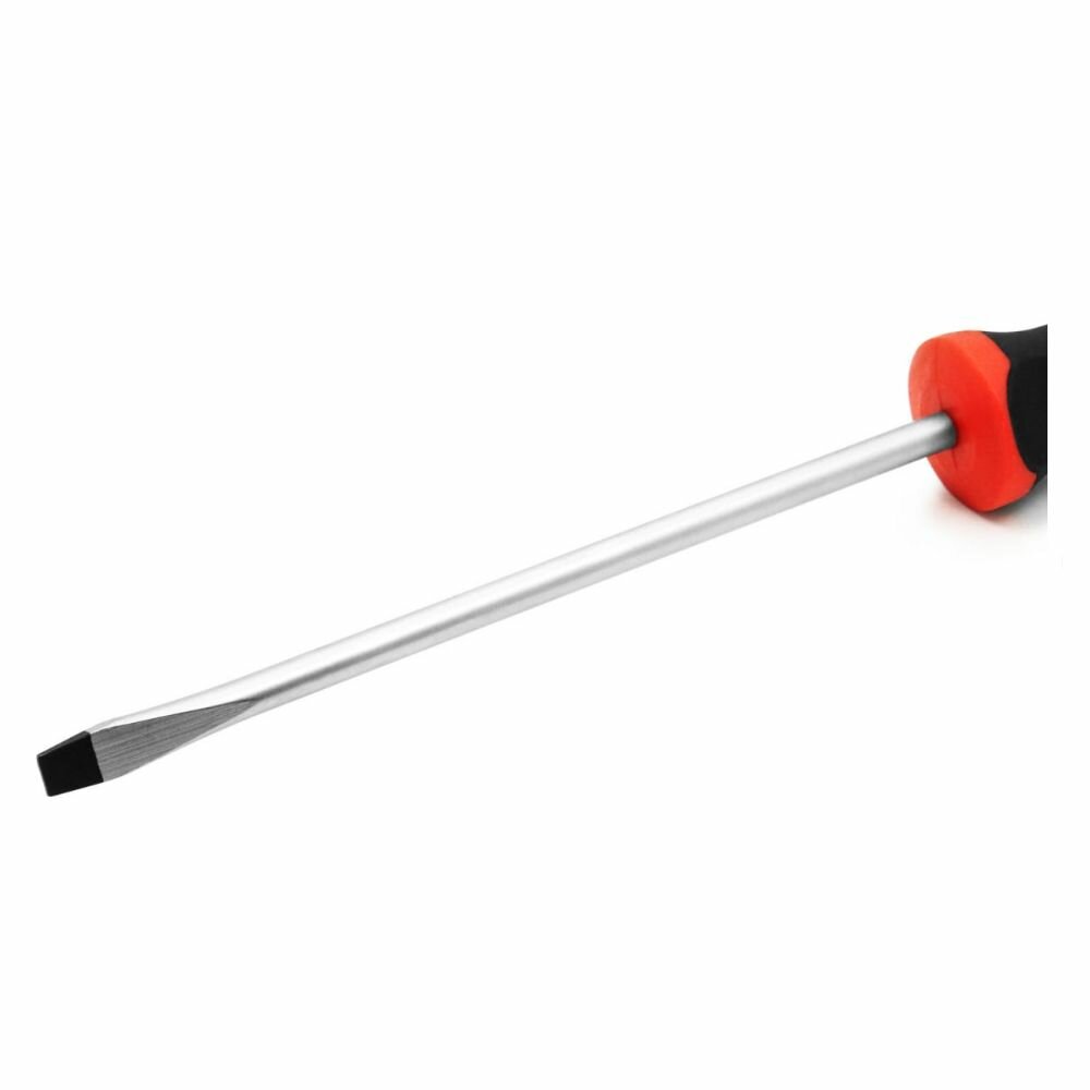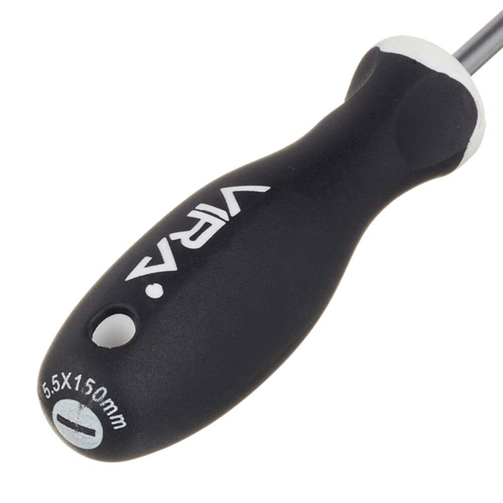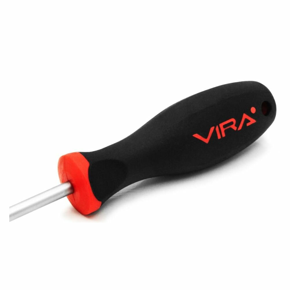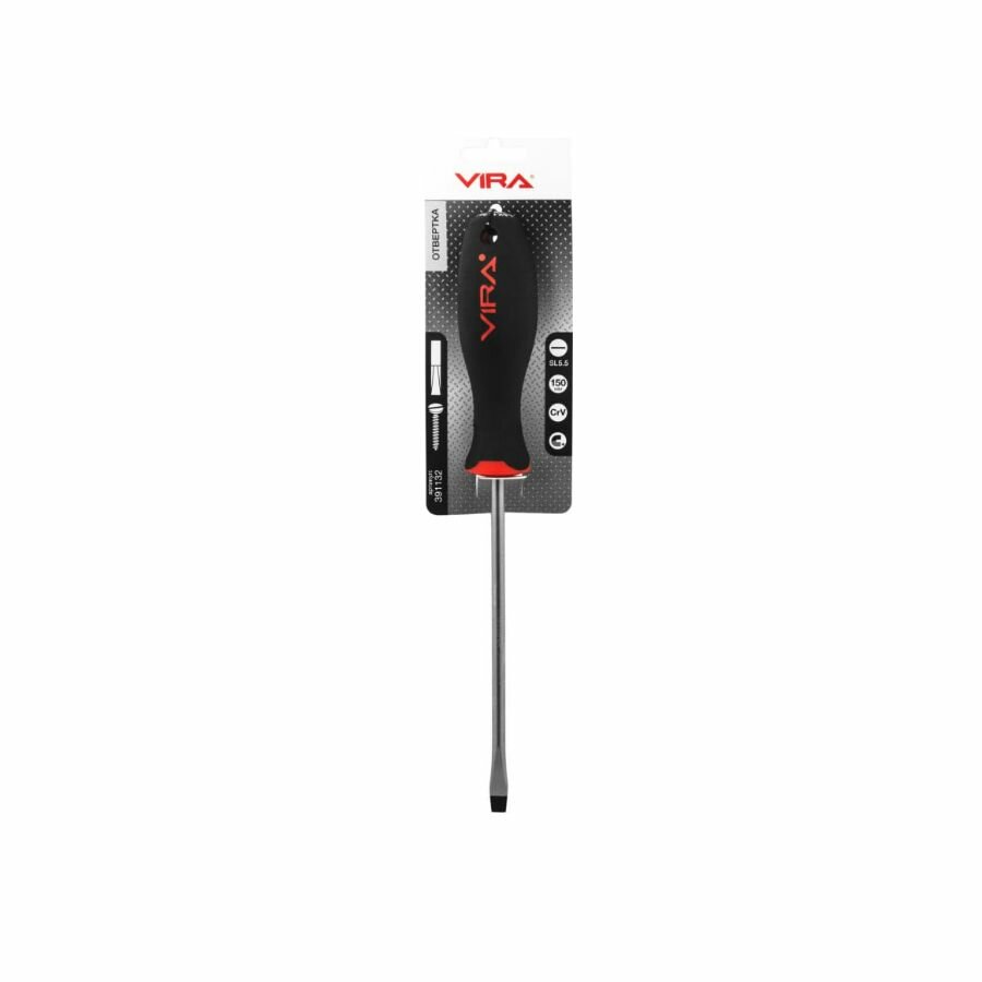 Отвертка VIRA Drive SL5,5x150. Размер шлица: SL5,5, длина стержня 150 мм. Набор отверток Drive изготовлен из хром-ванадия. Твердость 48-52 HRC. Отвертка в два раза превосходит международный стандарт DIN по показателю предельного крутящего момента. Все отвертки серии имеют магнитный наконечник – мелкий крепеж, детали будет удобнее вворачивать или извлекать, сложнее потерять. Мы привели геометрию жала отвертки в соответствие с промышленным стандартом – оно без люфта помещается в шлице крепежа, благодаря точной обработке углов наконечника. Работая нашей отверткой, Вы не только сбережете шлиц шурупа, но и надолго сохраните сам инструмент, снизите усилия на вращение. Отверстие в рукоятке можно использовать для подвешивания отвертки на стенде, а можно вставить в него вороток для дополнительного усиления крутящего момента. Мы называем рукоятку отвертки VIRA анатомической, потому что она имеет сглаженную трехгранную форму, которая удобно обхватывается рукой, а большой палец естественным образом вкладывается в одно из углублений. Все перечисленные особенности ручки дают возможность создавать больший крутящий момент при меньших усилиях с вашей стороны. Рукоятки отверток выполнены из прочного пластика и упругой резины TPR. Такое сочетание материалов делает ручку крепкой, но мягкой для вашей ладони. Никаких царапающих швов и резких граней. Резиновое покрытие обладает антискользящим эффектом.