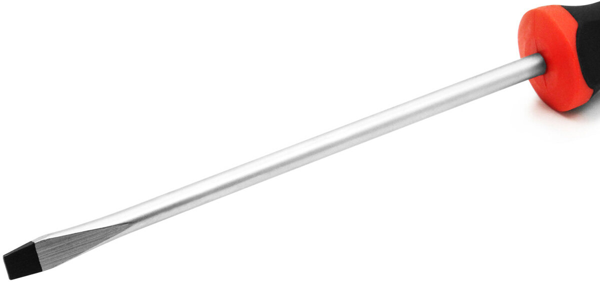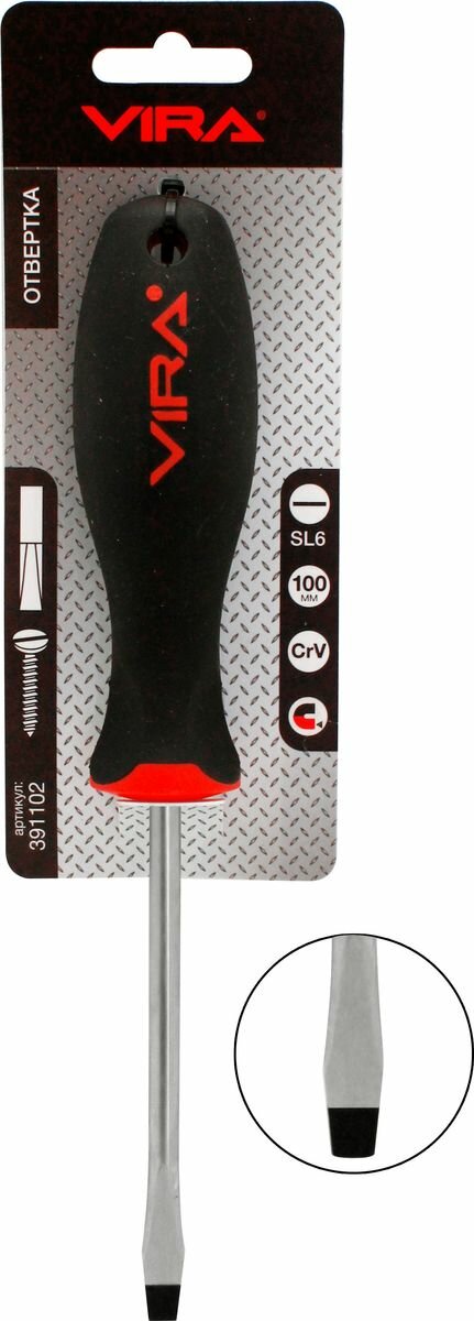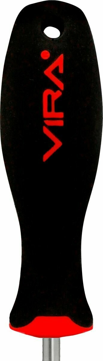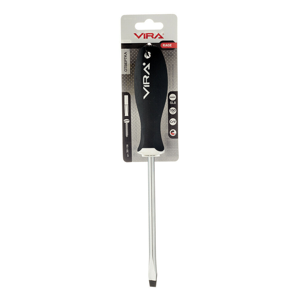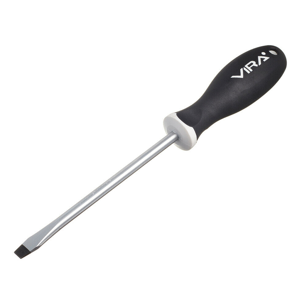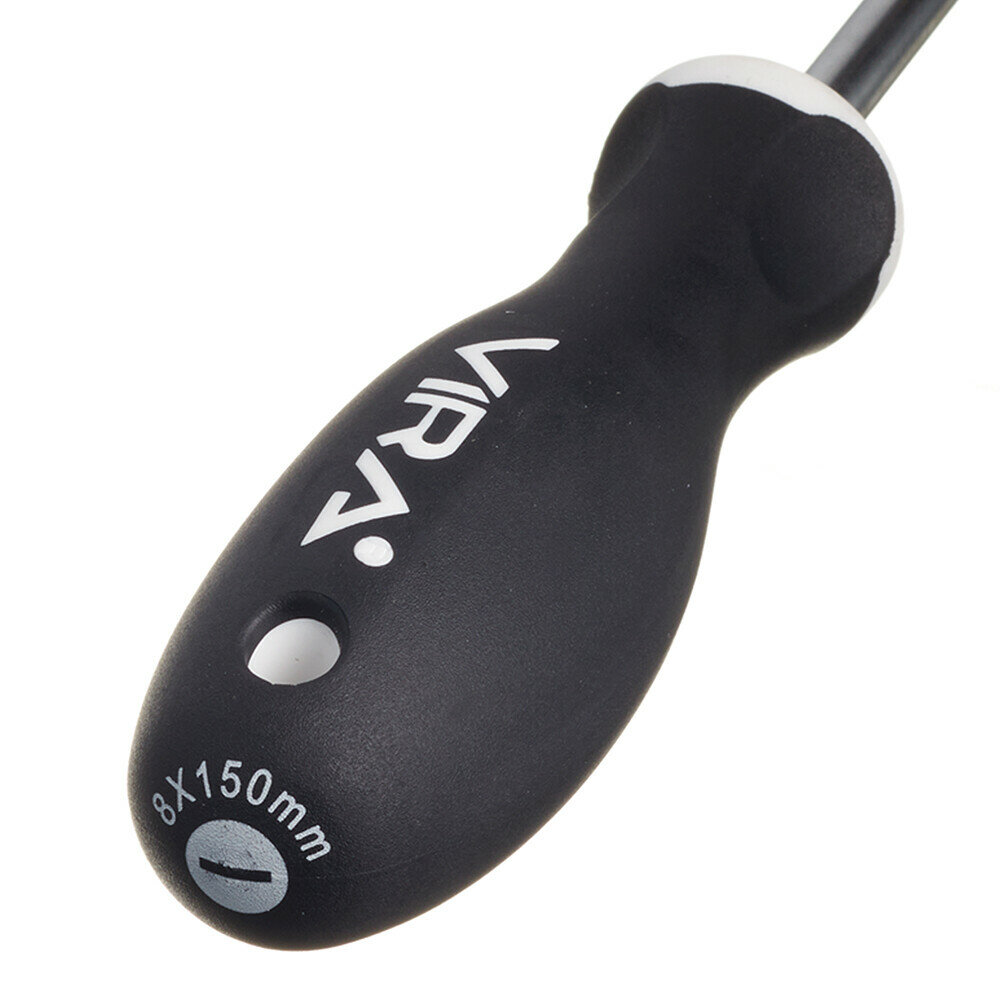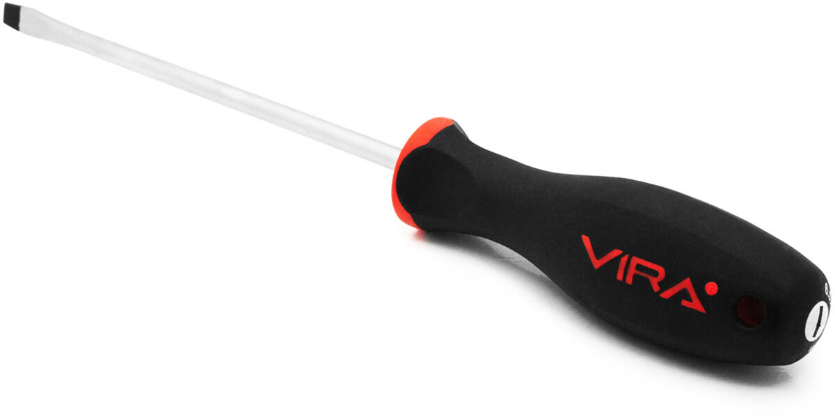 Отвертка VIRA Drive SL8x150. Набор отверток Drive изготовлен из хром-ванадия. Твердость 48-52 HRC. Отвертка в два раза превосходит международный стандарт DIN по показателю предельного крутящего момента. Все отвертки серии имеют магнитный наконечник – мелкий крепеж, детали будет удобнее вворачивать или извлекать, сложнее потерять. Мы привели геометрию жала отвертки в соответствие с промышленным стандартом – оно без люфта помещается в шлице крепежа, благодаря точной обработке углов наконечника. Работая нашей отверткой, Вы не только сбережете шлиц шурупа, но и надолго сохраните сам инструмент, снизите усилия на вращение. Отверстие в рукоятке можно использовать для подвешивания отвертки на стенде, а можно вставить в него вороток для дополнительного усиления крутящего момента. Мы называем рукоятку отвертки VIRA анатомической, потому что она имеет сглаженную трехгранную форму, которая удобно обхватывается рукой, а большой палец естественным образом вкладывается в одно из углублений. Все перечисленные особенности ручки дают возможность создавать больший крутящий момент при меньших усилиях с вашей стороны. Рукоятки отверток выполнены из прочного пластика и упругой резины TPR. Такое сочетание материалов делает ручку крепкой, но мягкой для вашей ладони. Никаких царапающих швов и резких граней. Резиновое покрытие обладает антискользящим эффектом. Размер шлица SL8, длина стержня 150 мм.