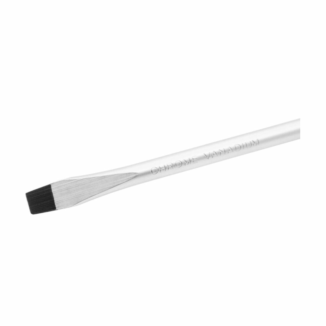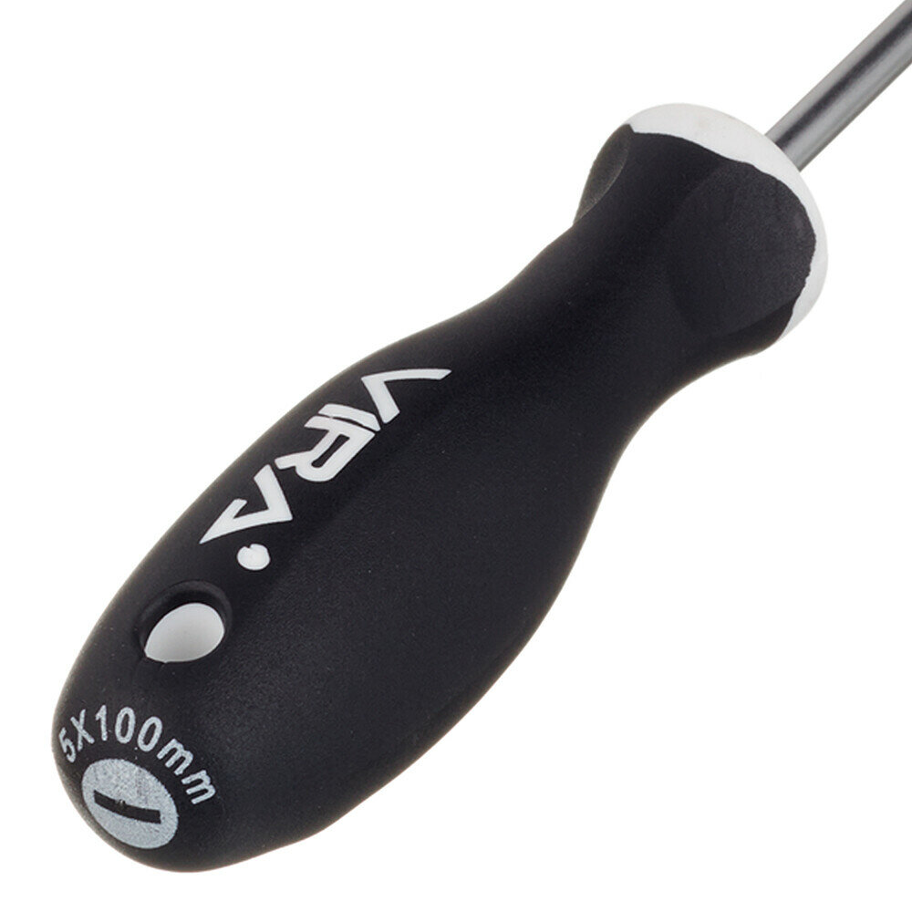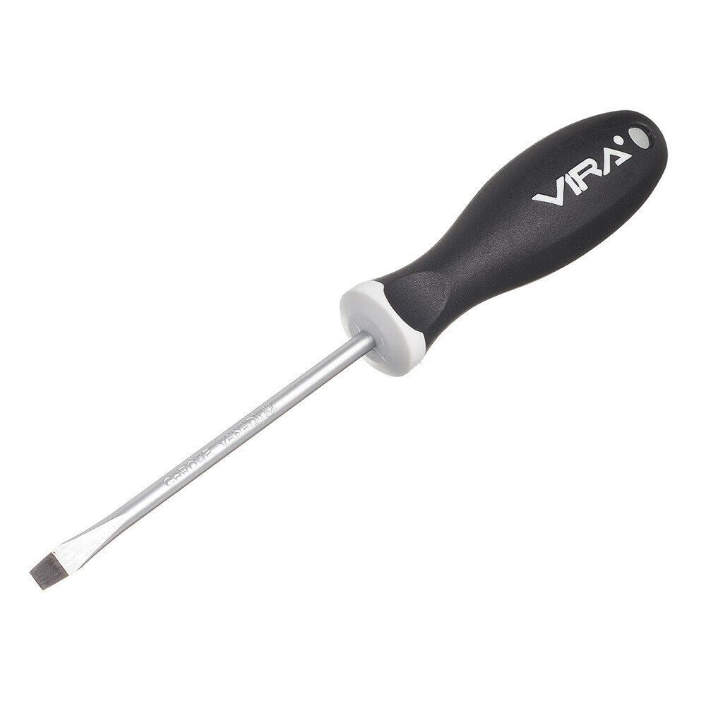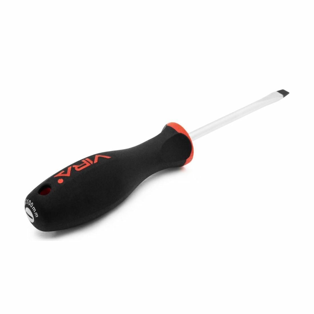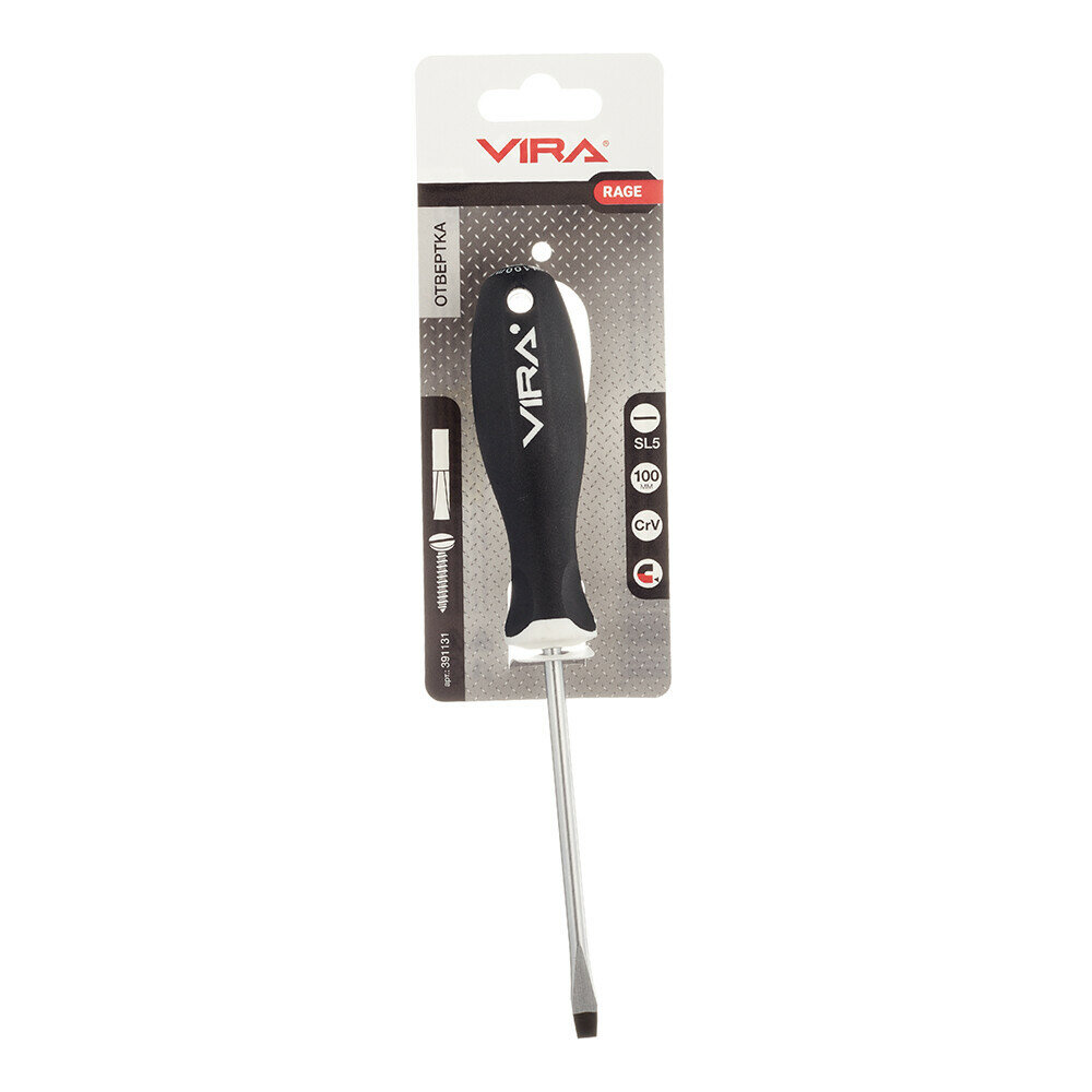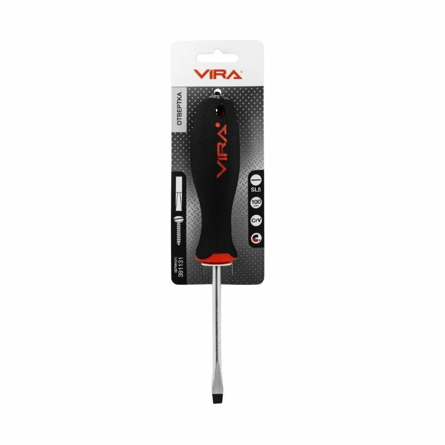 Отвертка VIRA Drive SL5x100. Набор отверток Drive изготовлен из хром-ванадия. Твердость 48-52 HRC. Отвертка в два раза превосходит международный стандарт DIN по показателю предельного крутящего момента. Все отвертки серии имеют магнитный наконечник – мелкий крепеж, детали будет удобнее вворачивать или извлекать, сложнее потерять. Мы привели геометрию жала отвертки в соответствие с промышленным стандартом – оно без люфта помещается в шлице крепежа, благодаря точной обработке углов наконечника. Работая нашей отверткой, Вы не только сбережете шлиц шурупа, но и надолго сохраните сам инструмент, снизите усилия на вращение. Отверстие в рукоятке можно использовать для подвешивания отвертки на стенде, а можно вставить в него вороток для дополнительного усиления крутящего момента. Мы называем рукоятку отвертки VIRA анатомической, потому что она имеет сглаженную трехгранную форму, которая удобно обхватывается рукой, а большой палец естественным образом вкладывается в одно из углублений. Все перечисленные особенности ручки дают возможность создавать больший крутящий момент при меньших усилиях с вашей стороны. Рукоятки отверток выполнены из прочного пластика и упругой резины TPR. Такое сочетание материалов делает ручку крепкой, но мягкой для вашей ладони. Никаких царапающих швов и резких граней. Резиновое покрытие обладает антискользящим эффектом. Размер шлица: SL5, длина стержня 100 мм.