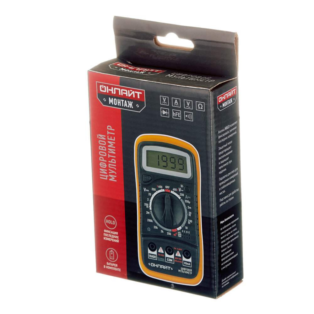 Цифровые мультиметры Онлайт Монтаж используются для проведения измерений электротехнических параметров сети и приборов при электромонтажных работах в быту и на производстве. 3,5 разрядный ЖК-дисплей с автоопределением полярности (макс. показание дисплея 1999). Надежный многопозиционный переключатель режимов работы и пределов измерений. Тестовые щупы, чехол и батарея в комплекте. Диапазон рабочих температур 0 +40 °С. Подставка для удобства работы за столом.