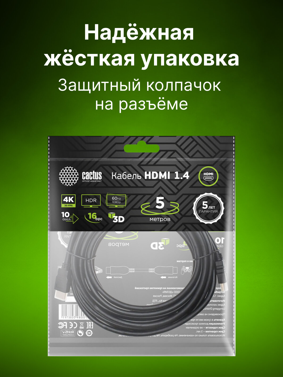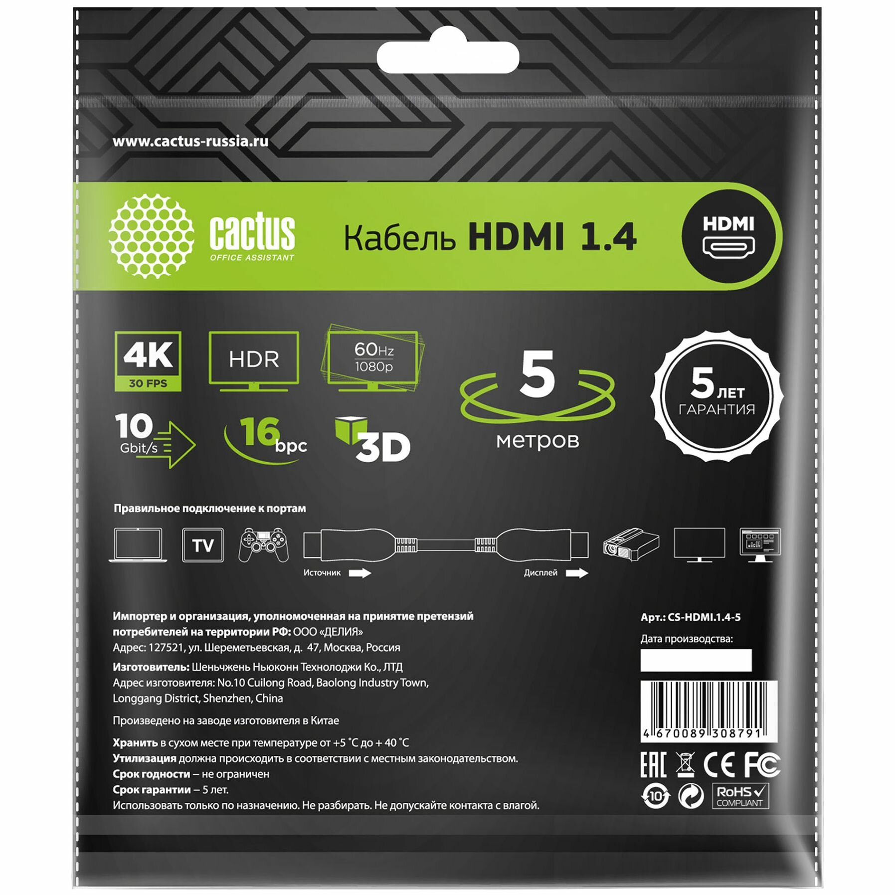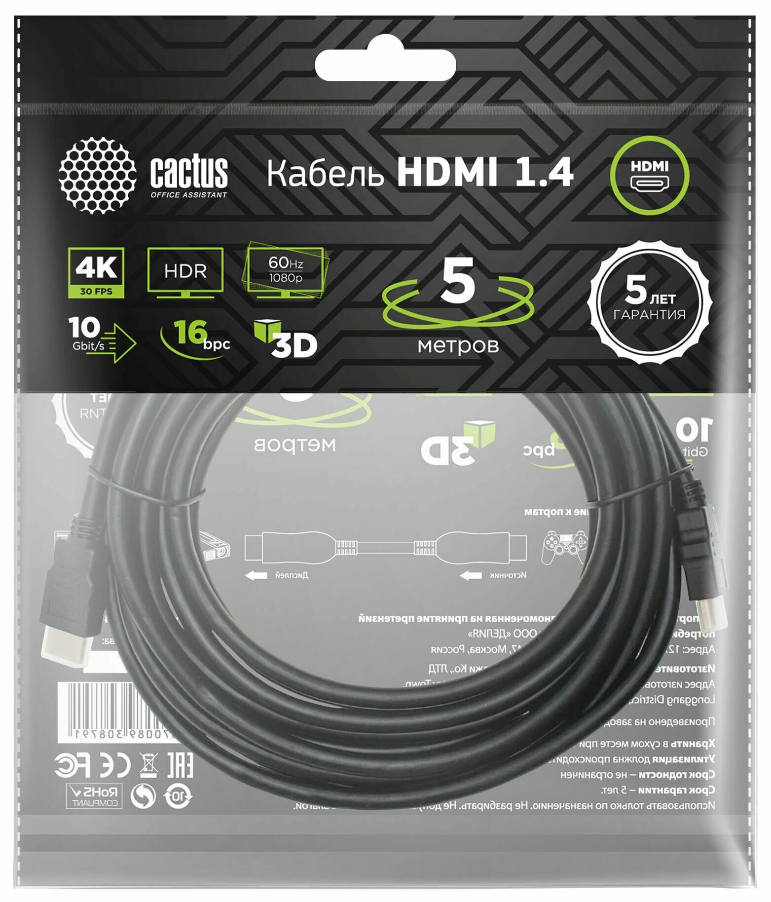 Кабель аудио-видео Cactus CS-HDMI.1.4-5 черный, разъем 1: HDMI (m), разъем 2: HDMI (m), длина 5м.