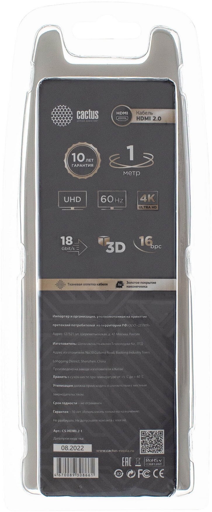 Кабель аудио-видео Cactus CS-HDMI.2-1 черный, разъем 1: HDMI (m), разъем 2: HDMI (m), длина 1м.