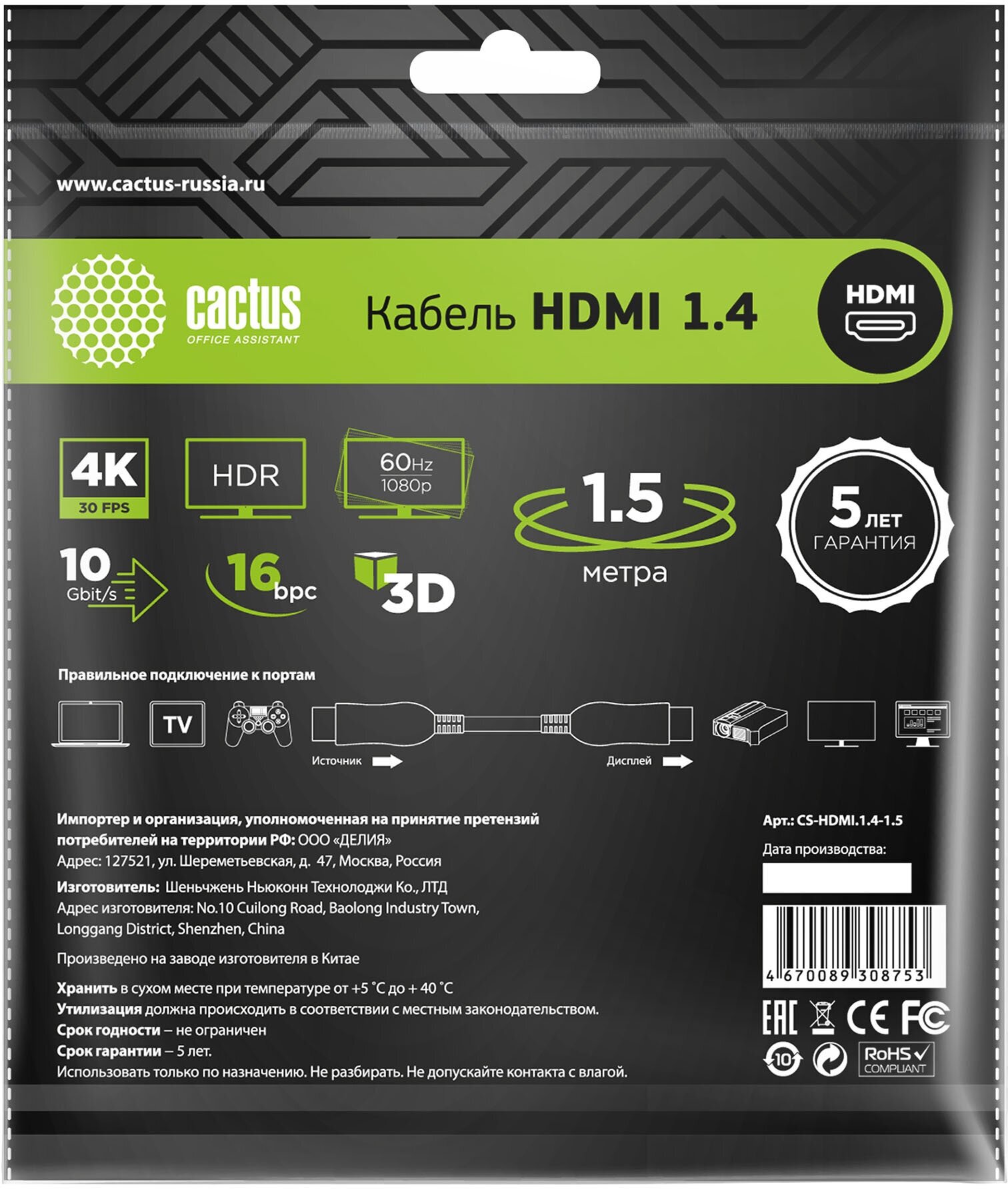 Кабель аудио-видео Cactus CS-HDMI.1.4-1.5 черный, разъем 1: HDMI (m), разъем 2: HDMI (m), длина 1.5м.