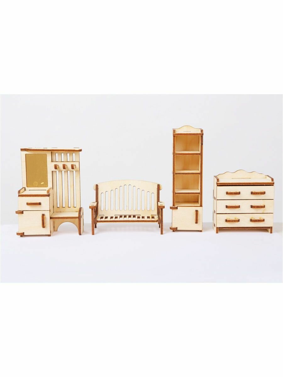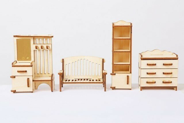 Габариты для примера: высота узкого шкафа 10см, длина 4см. Остальные предметы пропорционально. В набор входят все предметы на изображении.