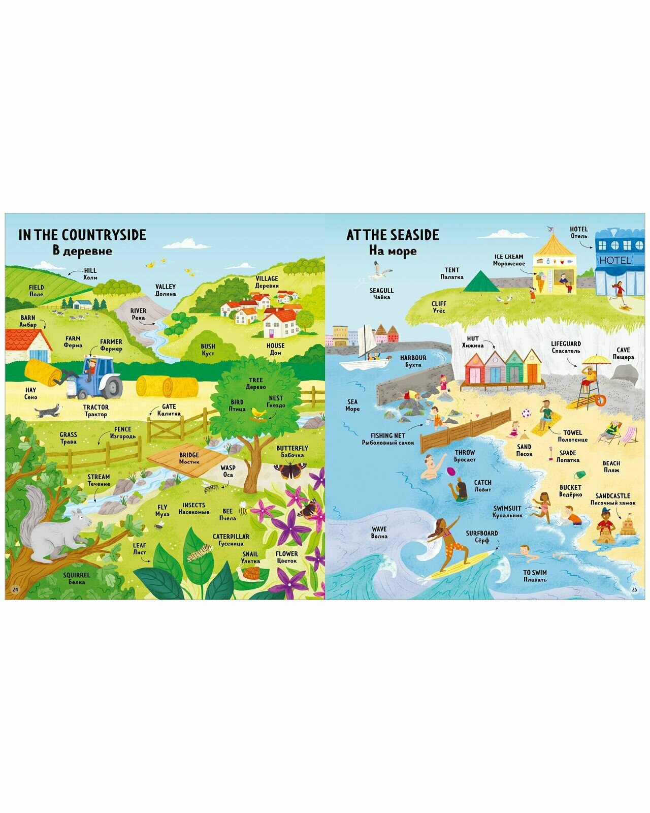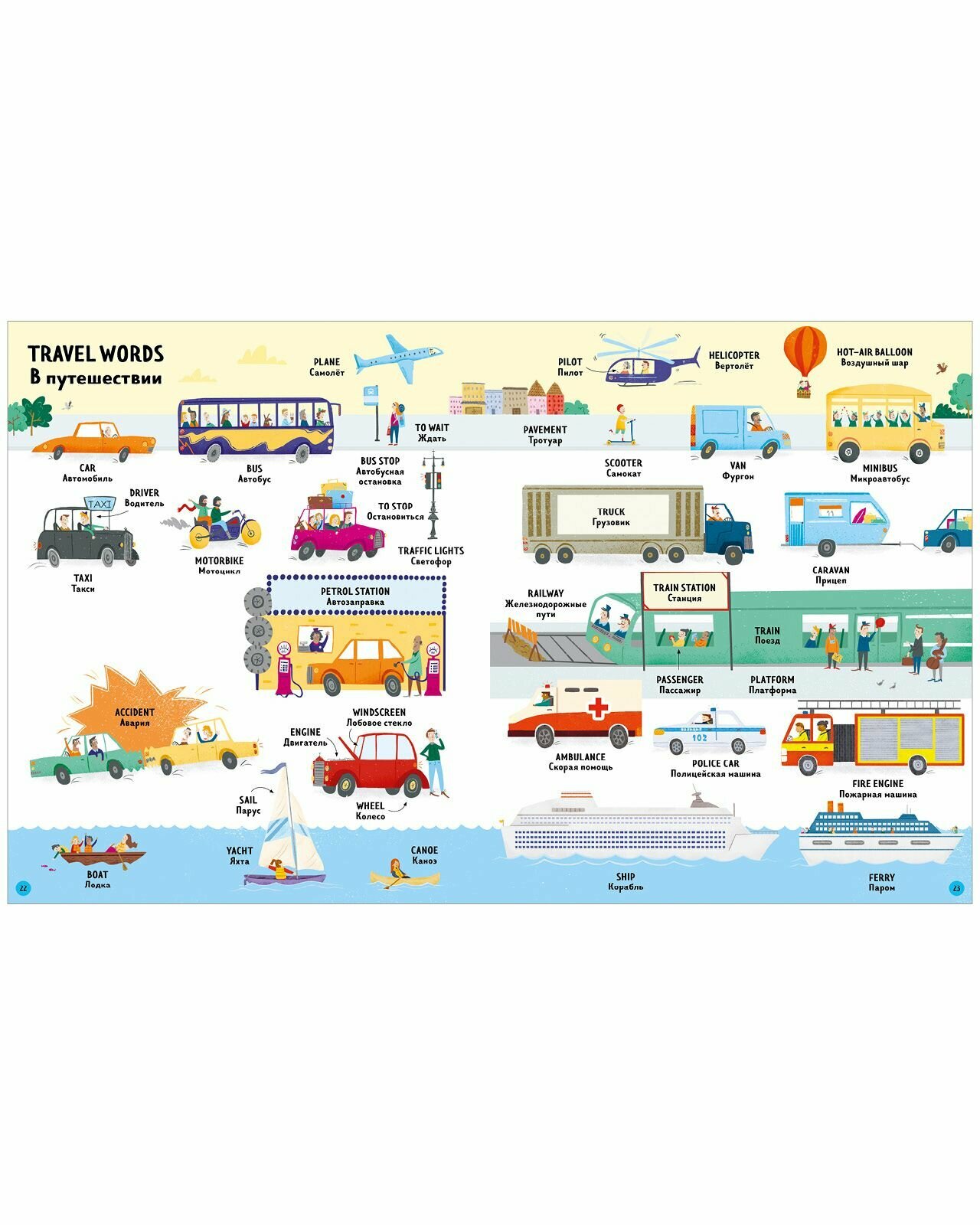 Ребенок пополнит словарный запас на самые нужные темы: транспорт, числа, животные, погода, предлоги и основные действия, профессии, одежда и другие. Яркие иллюстрации на дадут заскучать, благодаря большому формату их удобно разглядывать, а твердый переплет позволяет книге радовать вас не один год.