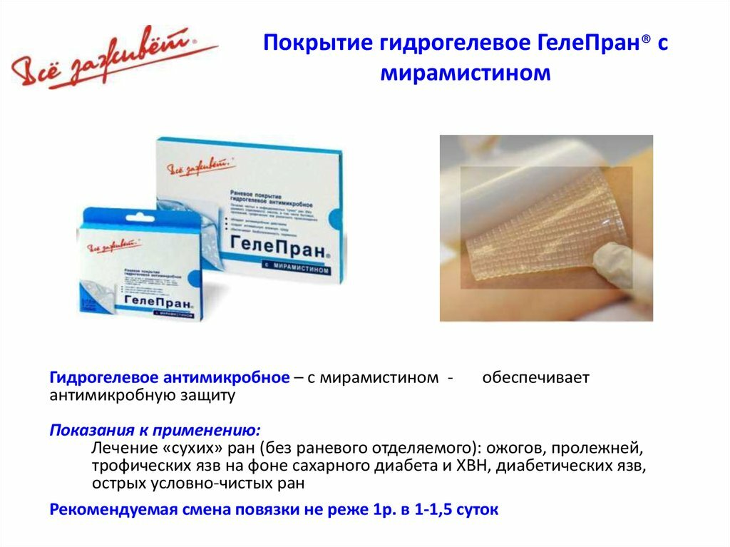 Показания к применению: лечение «сухих» ран (без раневого отделяемого) - ожогов, пролежней, трофических язв на фоне сахарного диабета и ХВН, диабетических язв, острых условно-чистых ран.