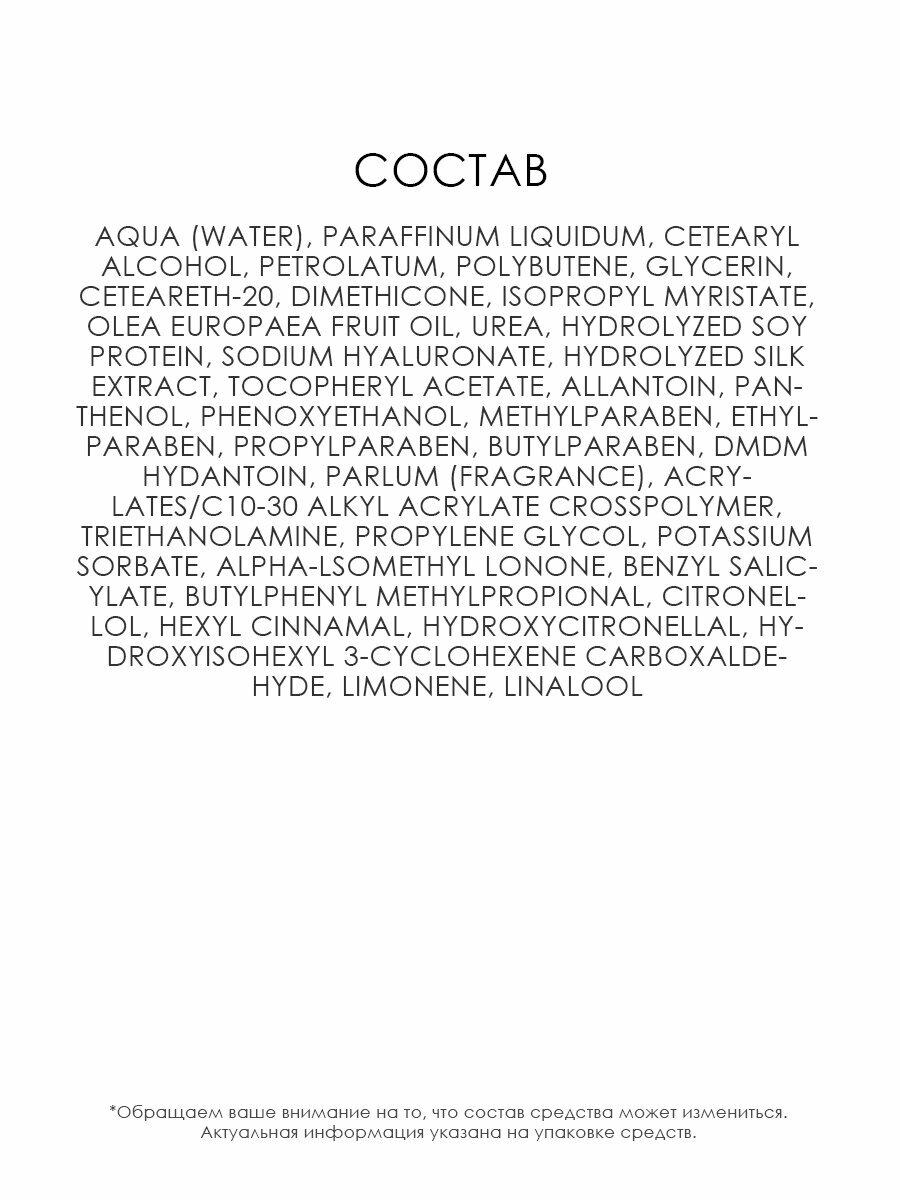 | Состав | Aqua (Water), Paraffinum Liquidum, Cetearyl Alcohol, Petrolatum, Polybutene, Glycerin, Ceteareth-20, Dimethicone, Isopropyl Myristate, Olea Europaea Fruit Oil, Urea, Hydrolyzed Soy Protein, Sodium Hyaluronate, Hydrolyzed Silk Extract, Tocopheryl Acetate, Allantoin, Panthenol, Phenoxyethanol, Methylparaben, Ethylparaben, Propylparaben, Butylparaben, DMDM Hydantoin, Parlum (Fragrance), Acrylates/C10-30 Alkyl Acrylate Crosspolymer, Triethanolamine, Propylene Glycol, Potassium Sorbate, Alpha-lsomethyl lonone, Benzyl Salicylate, Butylphenyl Methylpropional, Citronellol, Hexyl Cinnamal, Hydroxycitronellal, Hydroxyisohexyl 3-Cyclohexene Carboxaldehyde, Limonene, Linalool |