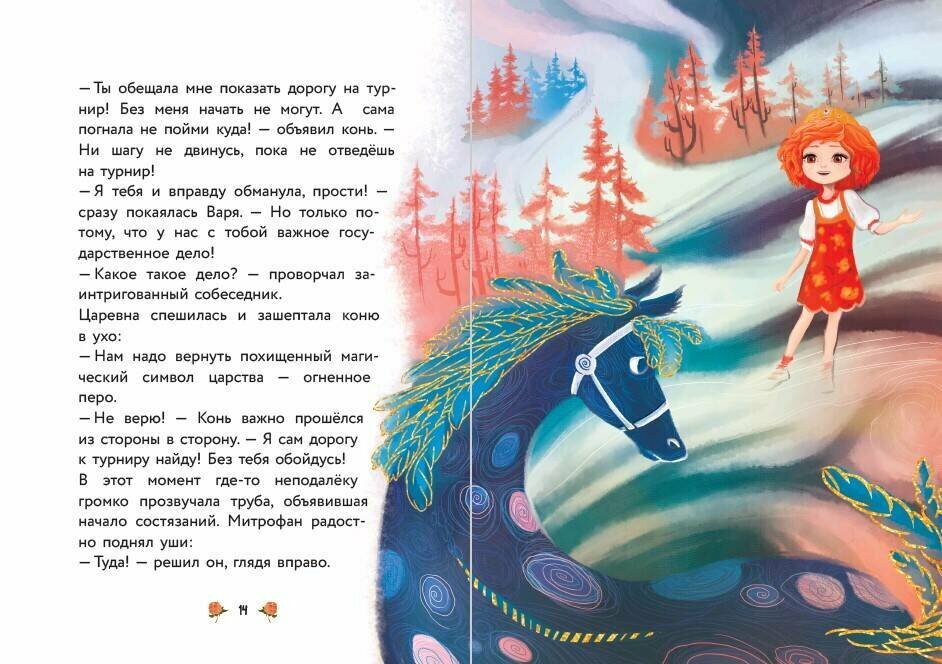 Хочешь узнать ещё больше о приключениях царевны Вари? Тогда читай эту книгу - в ней девочке предстоит отправиться по стопам Феникса, узнать всю правду о похищенном огненном пере и спасти Солнцеморье от его истинного врага. В компании своего верного коня, а также Вещего Ворона Варя преодолеет любые препятствия!