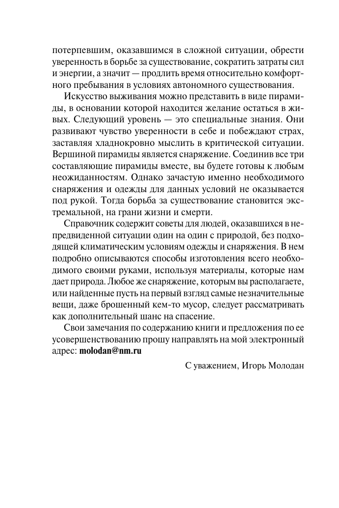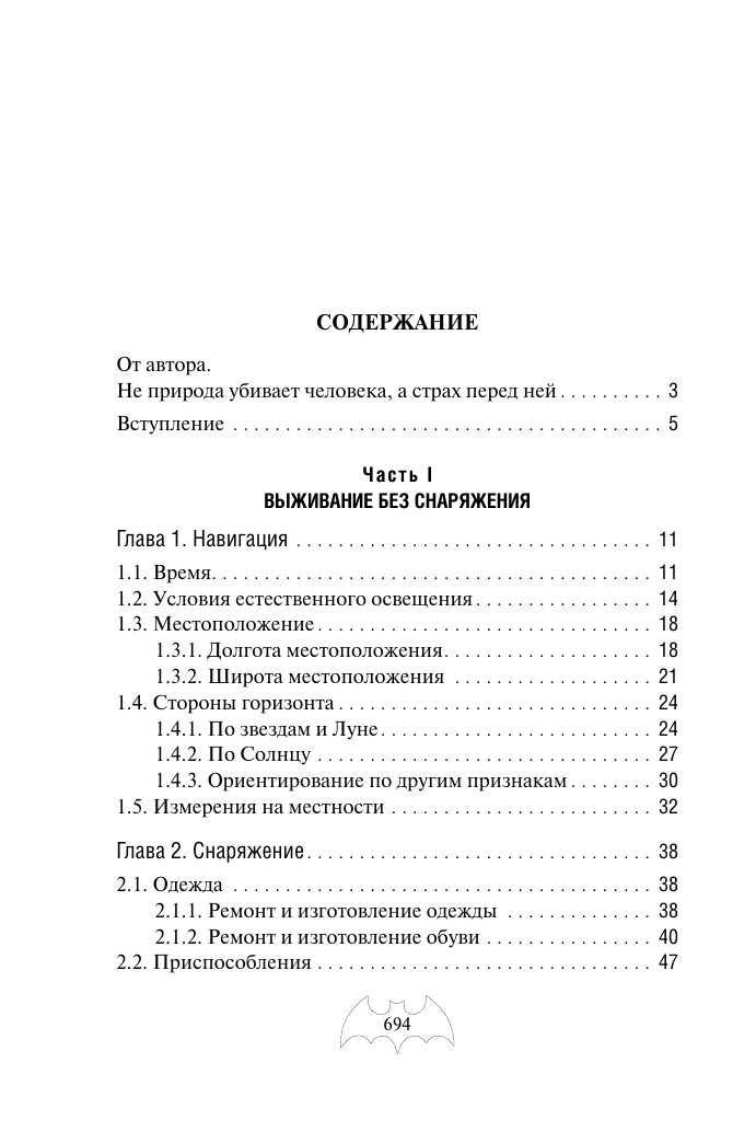 Книга представляет из себя максимально полный сборник правил и подсказок для выживания в дикой природе. Автор постепенно знакомит читателей с темой, плавно переходя от одного к другому. Каждая глава представлена максимально полно и подробно, встречаются даже самые неожиданные темы, например работа со шкурками животных для создания одежды. Некоторую информацию можно было бы и не добавлять в книгу, так как простому обывателю это навряд ли понадобится, но для ознакомления будет интересно.