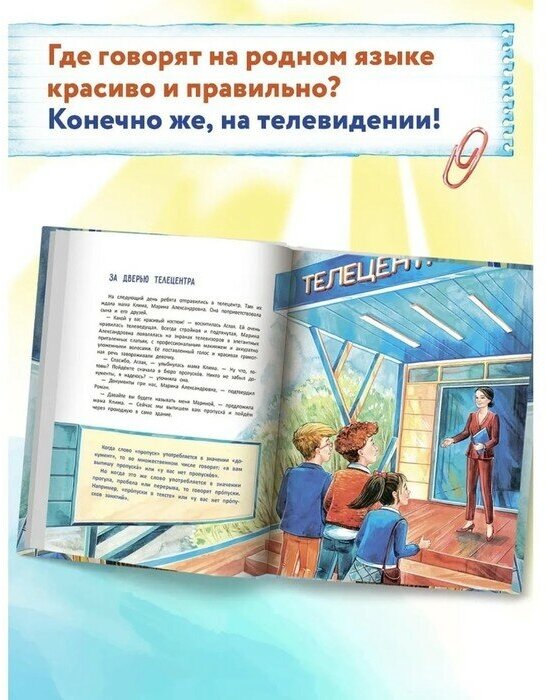 Читателю предлагается экскурс по телестудии, где забавный персонаж – робот Рося – проходит с героями тест по русскому языку, также книжные персонажи с читателями узнают о подготовке новостей к выходу в эфир, и становится понятно, что говорить грамотно очень важно.