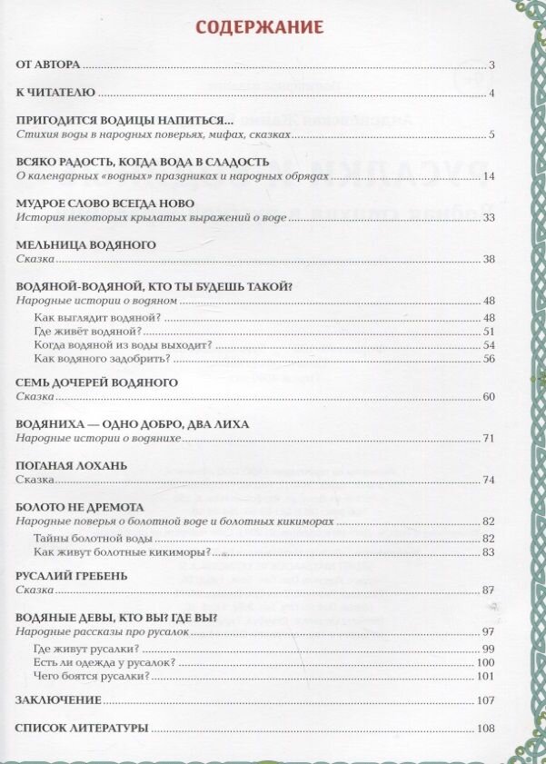 В нескольких главах в лёгкой, стилизованной форме рассказывается об интересных обрядах, традициях, связанных с водой и "водной" нечистью. Ещё несколько глав - это авторские сказки, написанные по мотивам известных славянских поверий. В качестве дополнения - пословицы, стихотворения и проза классиков русской литературы, интересные факты из русской культуры. А картины русских художников, творчество которых основано на сюжетах, "подсказанных" мифами и легендами нашего народа, делают содержание книги цельным, полным и очень красочным.