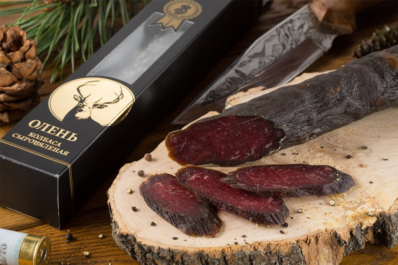 Этот продукт отличается высоким качеством и прекрасным вкусом. В подарочной упаковке появилась новая сыровяленая колбаса из оленины, которая станет настоящим деликатесом для истинных ценителей оленины.