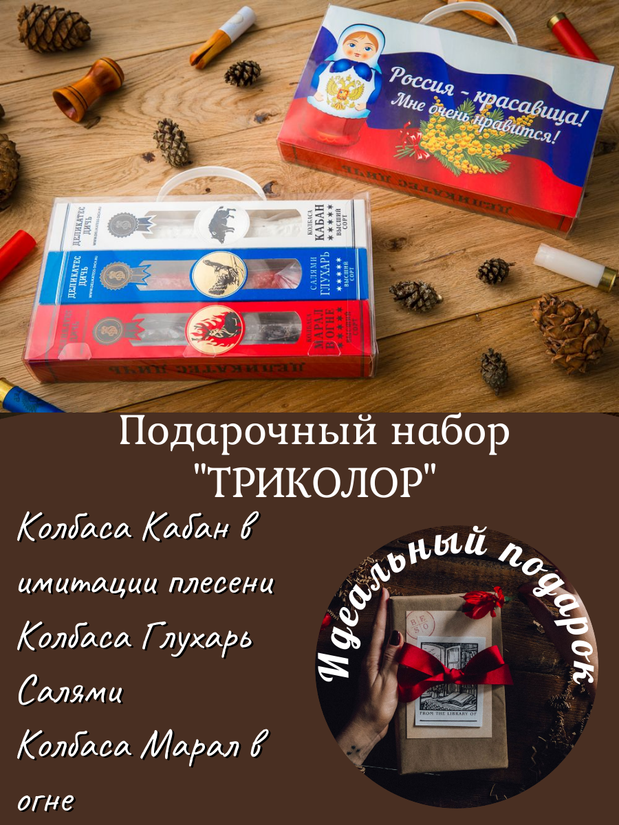 Подарочный набор "Триколор". В состав подарочного набора входят любимые многими продукты: колбаса из Марала, колбаса из Кабана, колбаса из Глухаря. Подарок находится в стилизованной под портфель упаковке. Вся продукция подбирается с лучшими сроками годности, так же как и мясо подбирается с разными животными для более шикарного и разнообразного состава. Это подарочный набор для мужчин и женщин супер класса! Вся продукция, входящая в состав набора, высочайшего качества. В подарочный набор для взрослых включены продукты из линейки деликатесов. Они, несомненно, станут украшением праздничного стола. Это отличный универсальный подарочный набор для мужчин и женщин. Если вы ломаете голову над тем, что подарить начальству, брату, свату, другу, любимому, подруге, коллеге, если вы хотите выразить благодарность и преподнести подарок, которому будут рады, то наши подарочные наборы от производителя — лучший выбор. Это знак внимания, который никогда не встанет в ряд ненужных подарков. Он всегда уместен и подходит в качестве подарка на Новый год, день рождения, юбилей, на День Матери, День Учителя, День Влюбленных, на 23 февраля и на 8 марта. Его можно брать с собой в качестве подарка на любое застолье. Его оценят гурманы, любители охоты и других активных видов отдыха. Если вы хотите приятно удивить своих близких, то подарочный набор для мужчин на 23 февраля станет отличным дополнением к праздничному застолью. Это отличный подарочный набор мужу вместо привычных уже бритвенных наборов или носков. Качественный подарочный бокс с деликатесами обрадует не только мужчин. Его можно презентовать мужчине и женщине, друзьям, родственникам и коллегам. Важен небанальный подход к оформлению подарочного набора и выбору продуктов. Удобная и стильная упаковка придает боксу весомый вид. Они станут прекрасным оформлением вашего подарка. На все колбасы срок годности 3 месяца со дня производства, мы стараемся отправлять товар , что бы в запасе был минимум месяц , для более точной информации всегда можно задать вопрос о сроках и мы уже точно скажем всю информацию о данной партии продукции. Уважаемые заказчики не забывайте пожалуйста, что Деликатес Дичь одна из самых премиальных дорогих и редких съедобных деликатесов на рынке, где суммы за кг идут в тысячах, оттуда и складывается стоимость на подарки.