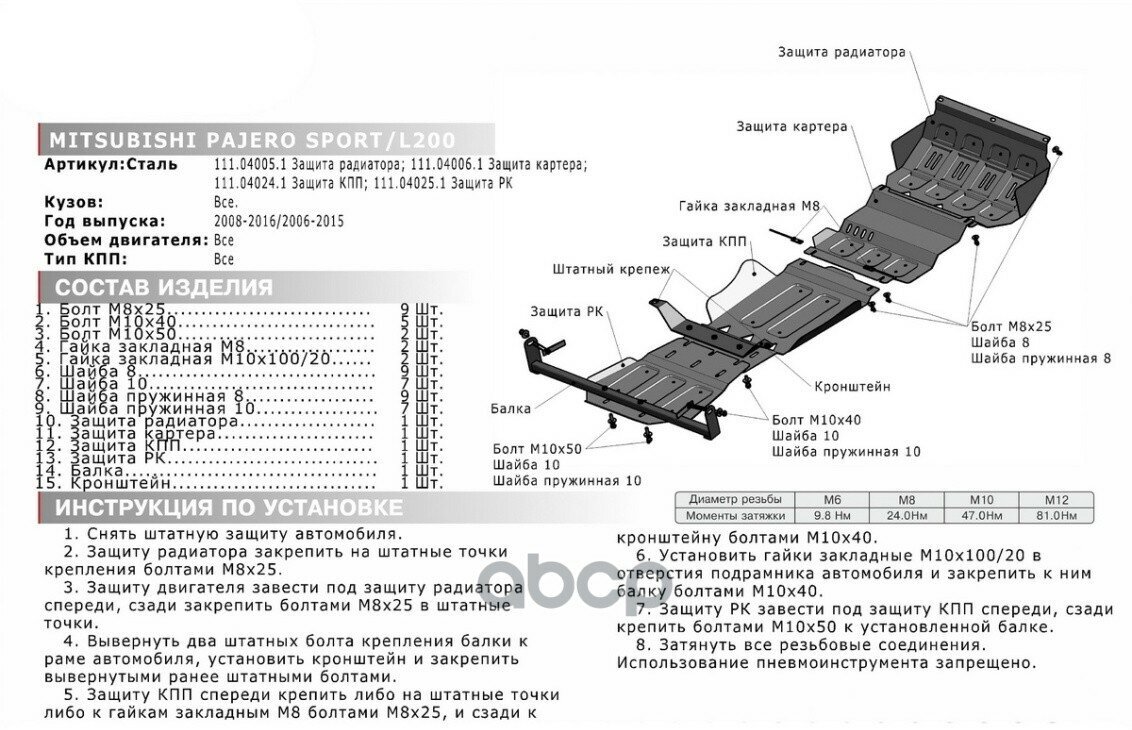 | Комплектация | защита - 1 шт., комплект крепежа, инструкция по установке, упаковка |