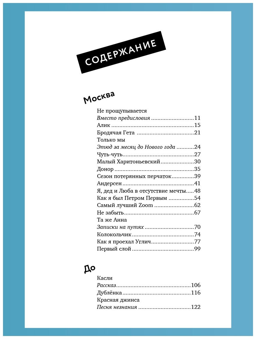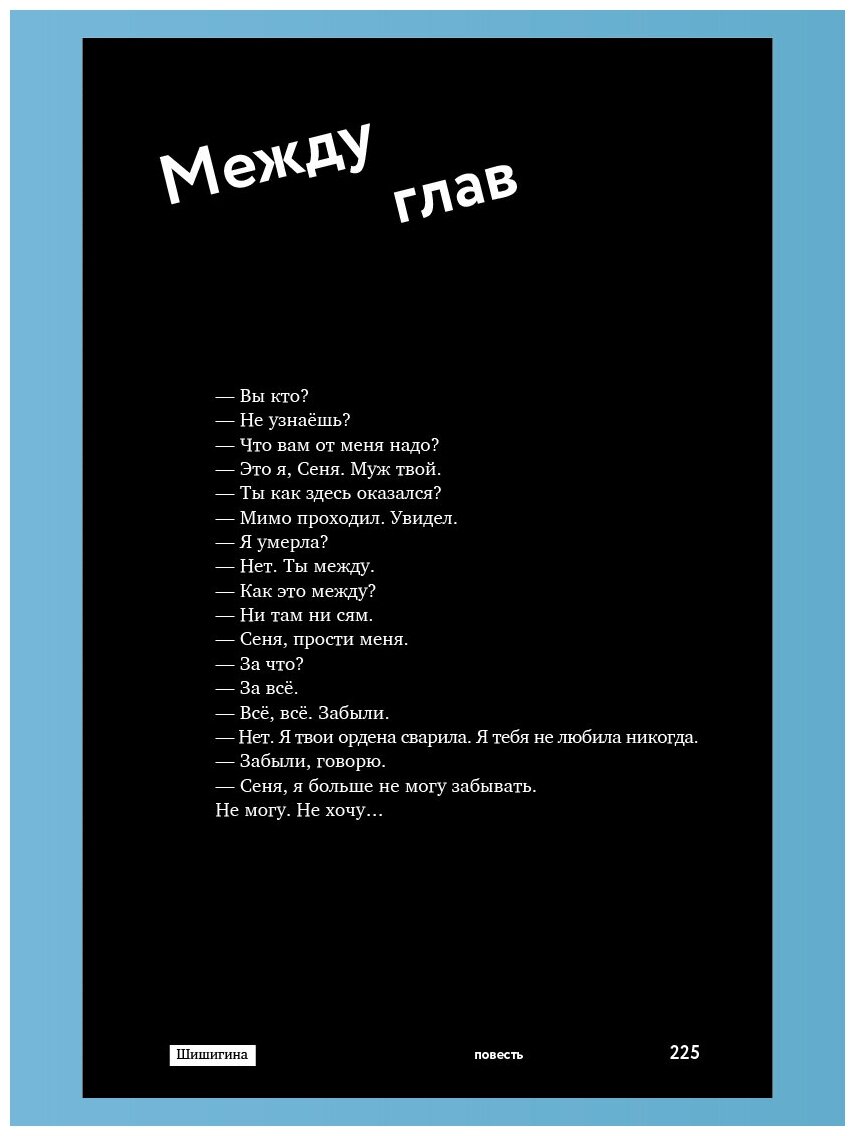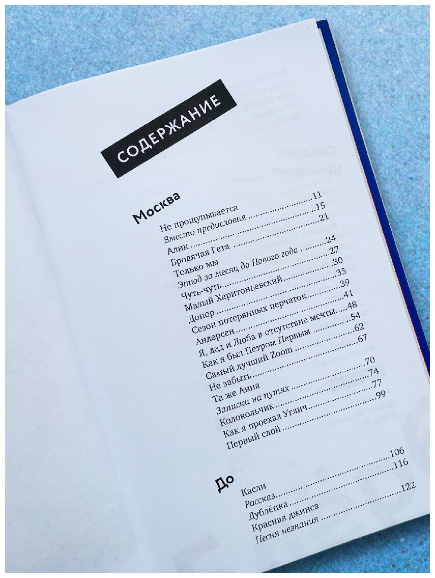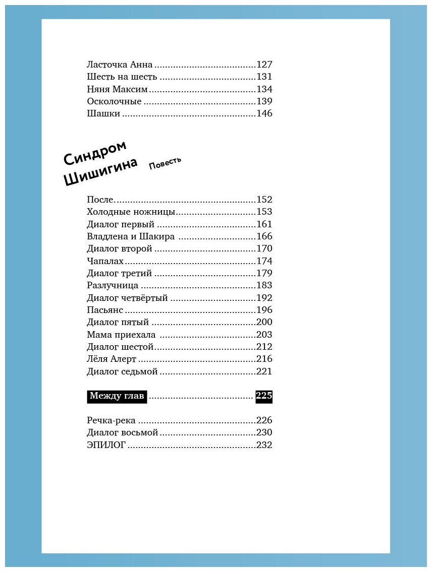 Книга отчасти автобиографическая и построена по принципу обратной хронологии. Ее открывают стильные и остроумные московские тексты, а венчает мощным аккордом пронзительная повесть «Синдром Шишигина», отражающая реалии детства и юности автора. Тонкая, психологически точная, с блестящими диалогами, она с ходу включает читателя в коллизию отношений внука и его любимой бабушки, страдающей деменцией. Повесть полна любви, проникнута живой болью и нежностью.
