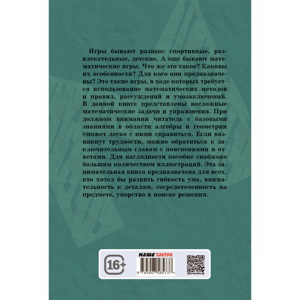 Игры бывают разные: спортивные, развлекательные, детские. А еще бывают математические игры. Что же это такое? Каковы их особенности? Для кого они предназначены? Это такие игры, в ходе которых требуется использование математических методов и правил, рассуждений и умозаключений. В данной книге представлены несложные математические задачи и упражнения. При должном внимании читатель с базовыми знаниями в области алгебры и геометрии сможет легко с ними справиться. Если возникнут трудности, можно обратиться к заключительным главам с пояснениями и ответами. Для наглядности пособие снабжено большим количеством иллюстраций. Эта занимательная книга предназначена для всех, кто хотел бы развить гибкость ума, внимательность к деталям, сосредоточенность на предмете, упорство в поиске решения.
