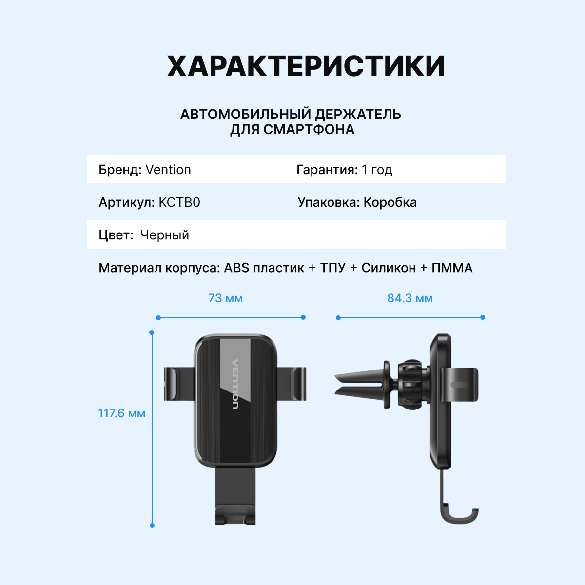 Vention это универсальное устройство для удобного расположения смартфона. Держатель крепится на вентиляционную решетку автомобиля. Автоматический механизм зажима позволит гаджету держаться в зафиксированном положении, а прочный пластик обеспечит износостойкость в процессе эксплуатации.