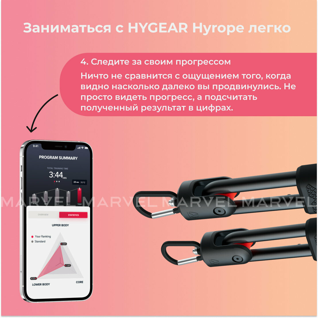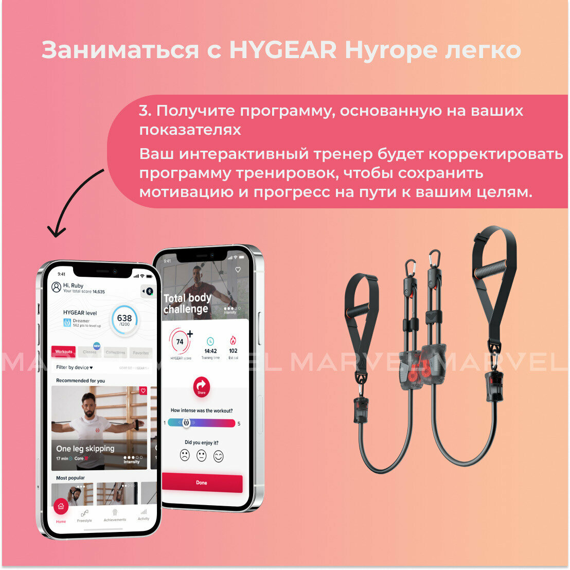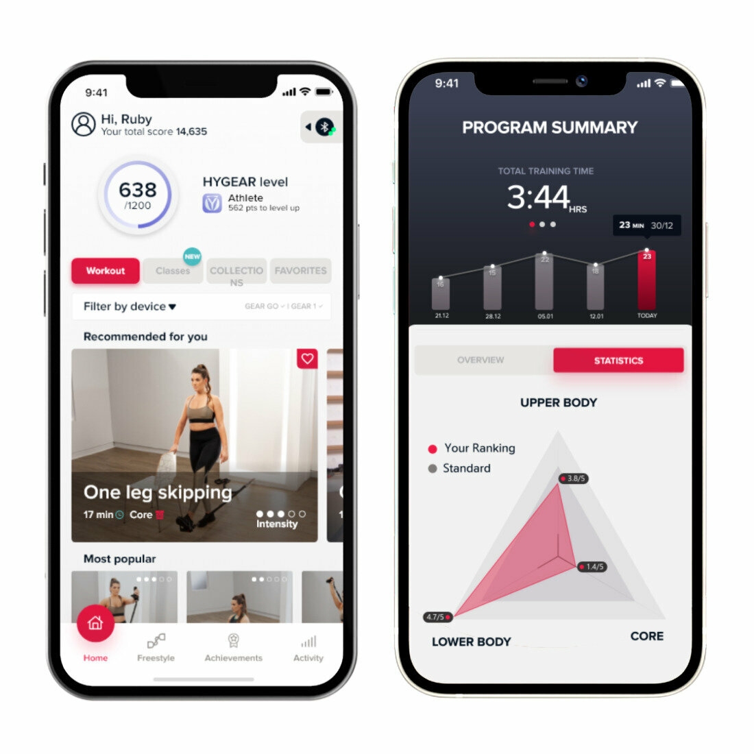 HYGEAR делает тренировочный процесс простым и удобным. Система автоматически подсчитывает количество подходов, скорость, использованный в ходе занятий вес, время тренировки. Также в системе индивидуальных тренировок HYGEAR есть функция подсчёта сожжённых калорий.