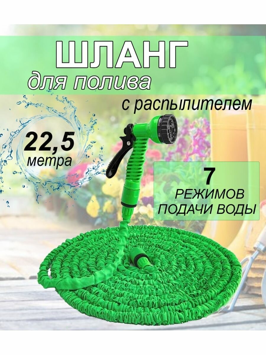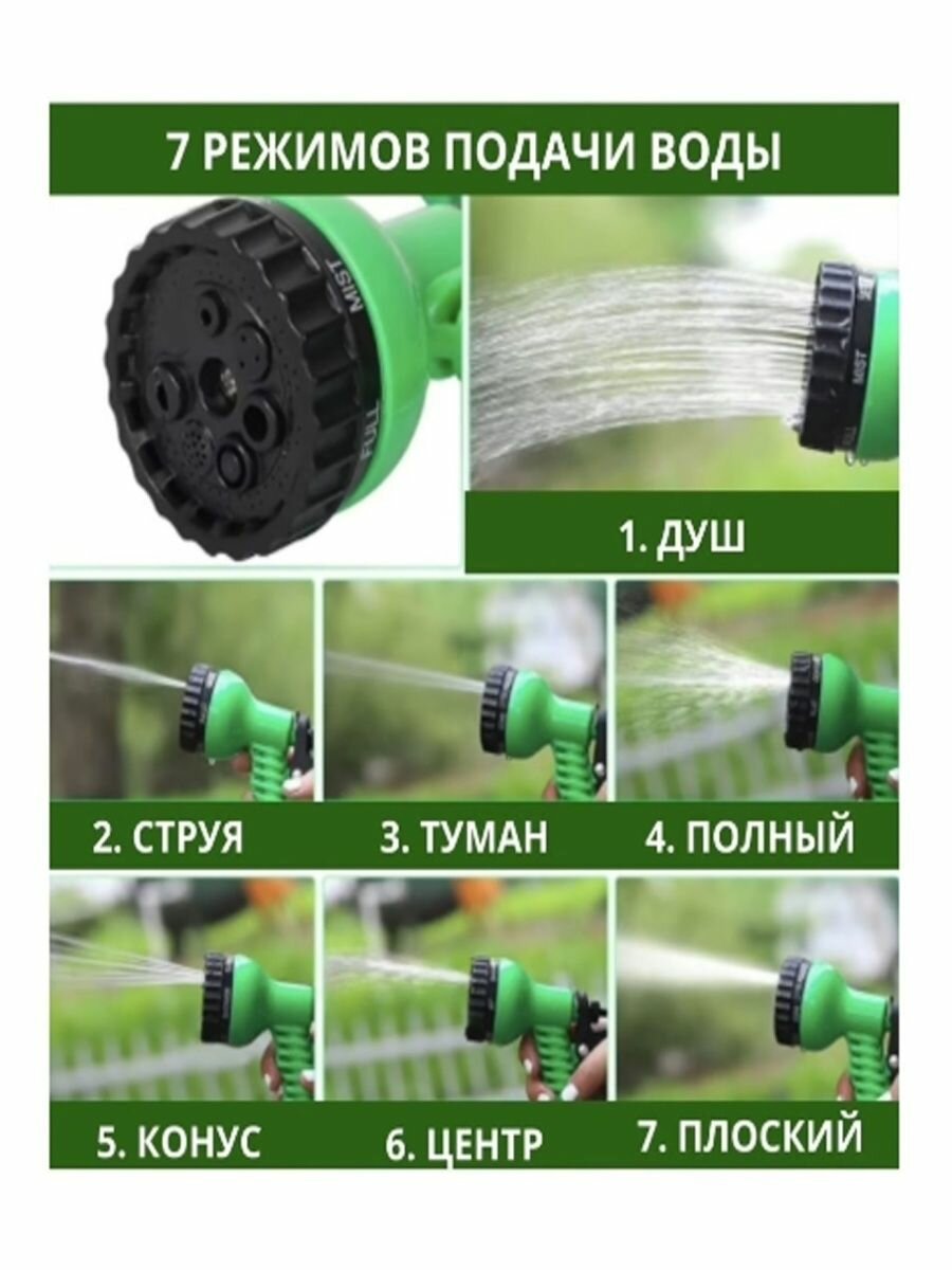 Способность шланга удлиняться до 3-х раз под напором воды позволяет значительно расширить зону полива. Небольшой вес набора существенно снижает усталость при выполнении поливочных работ. Небольшой вес набора существенно снижает усталость при выполнении поливочных работ.Шланг не перекручивается и не заламывается. Компактные размеры упрощаются процесс хранения и транспортировки. Способность шланга удлиняться до 3-х раз под напором воды позволяет значительно расширить зону полива. Форма и напор струи на выходе регулируется путем выбора одного из семи режимов распылителя (жесткая струя, душ, плоская струя, центр, конус, слабая струя, аэрирование) для более бережного полива любых садовых культур.Рабочее давление - 3 атм. Не рекомендуется использовать набор при давлении воды более 5 атм.Параметры и функции-Длина шланга: 7,5-22,5 м-Рабочее давление: 3 атм.-Число режимов распылителя: 7 -Режимы полива: жесткая струя, душ, плоская струя, центр, конус, слабая струя, аэрирование -Материал распылителя: пластик -Диаметр резьбы внешнего адаптера: 1/2", 3/4"