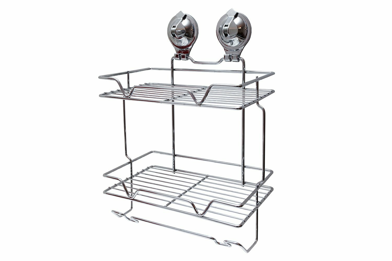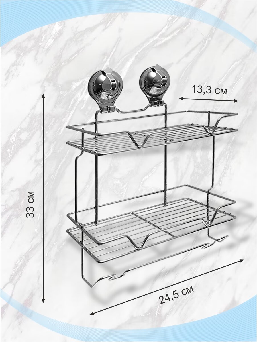 Полка двухъярусная на вакуумной присоске прекрасное решение для организации пространства. Наличие вакуумной присоски позволит легко и быстро разместить полку на глянцевой или очень гладкой поверхности. Компактная и прочная полка станет прекрасным решением для хранения бытовых мелочей и принадлежностей на кухне или в ванной комнате. Изготовлен из высококачественной стали с прочным хромированным покрытием. Универсальный стиль подойдет для любого интерьера. При монтаже важно следовать инструкции.