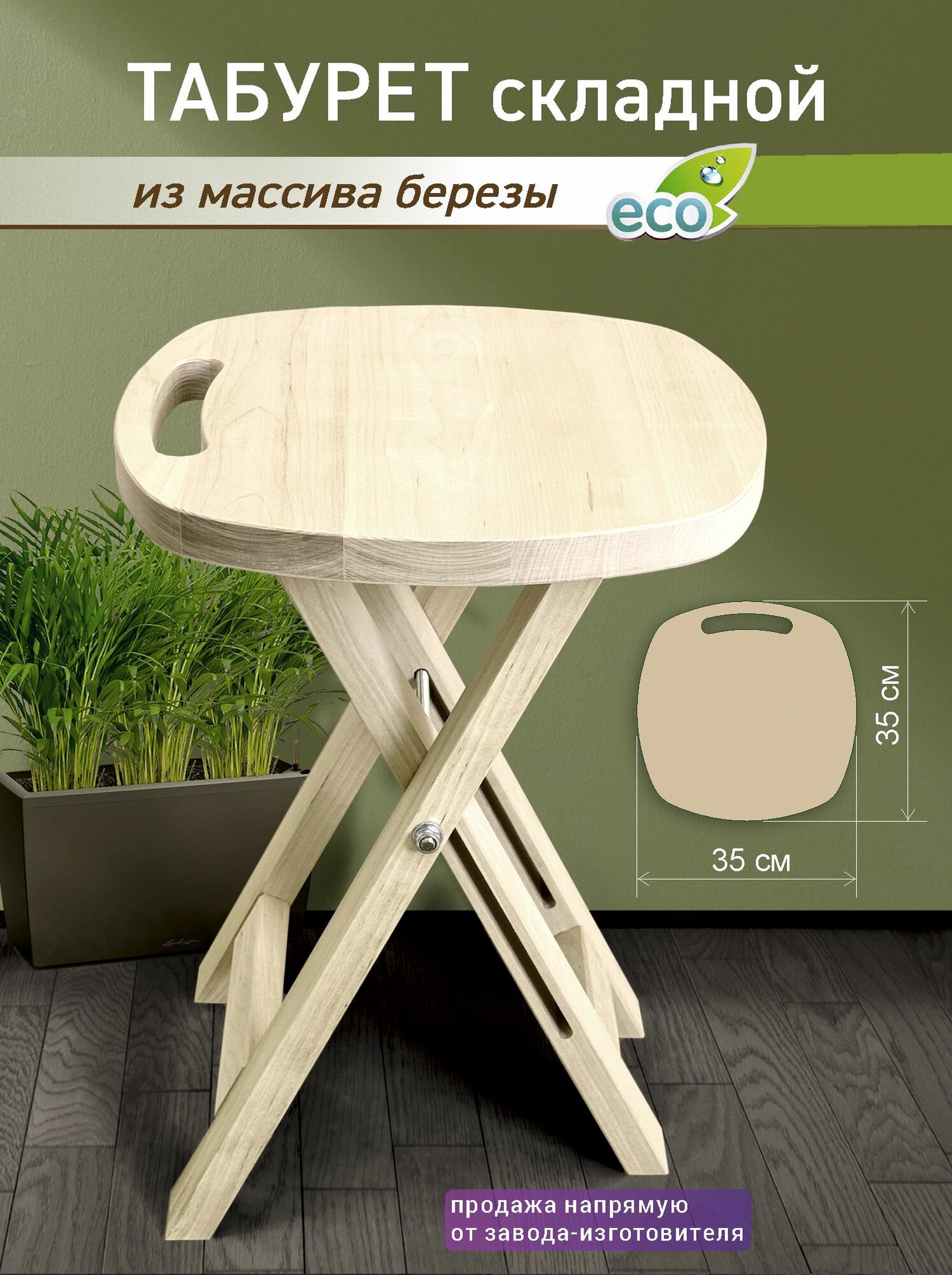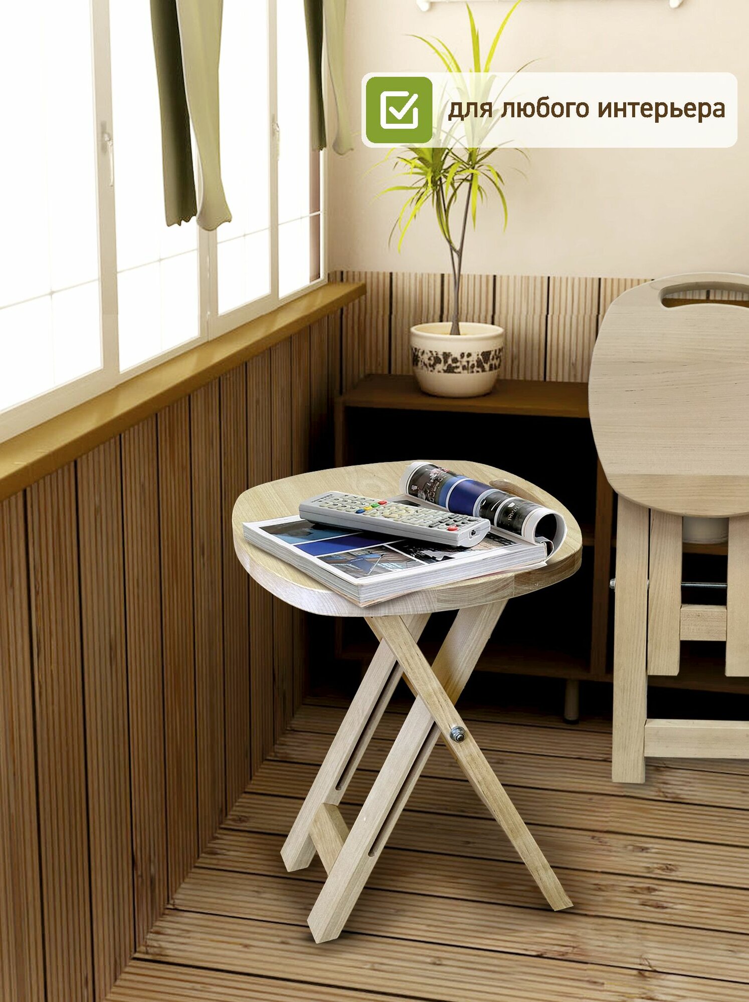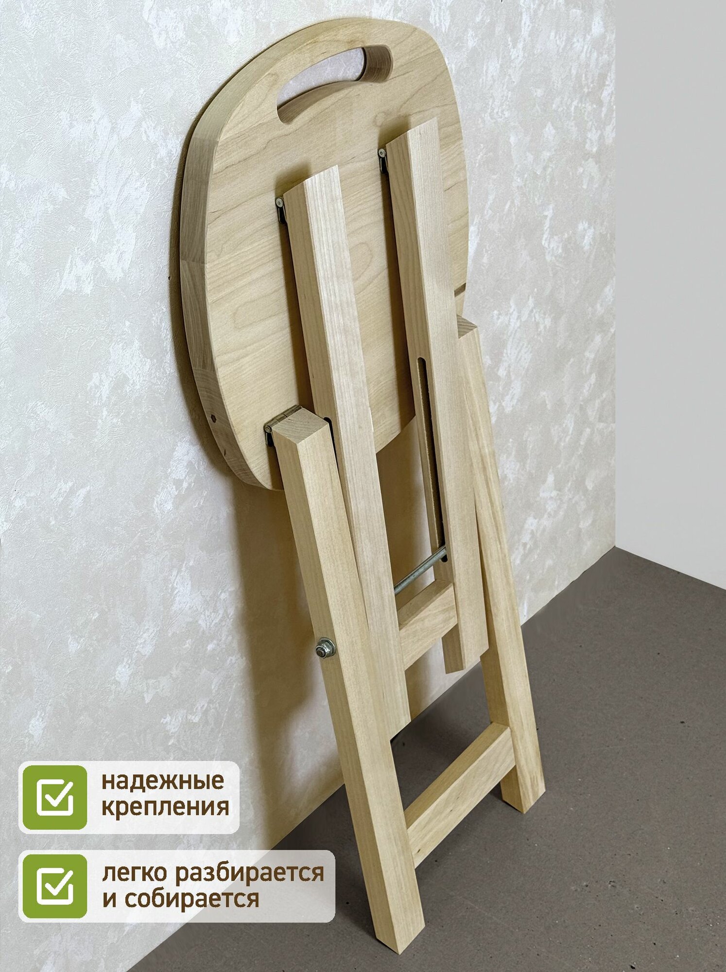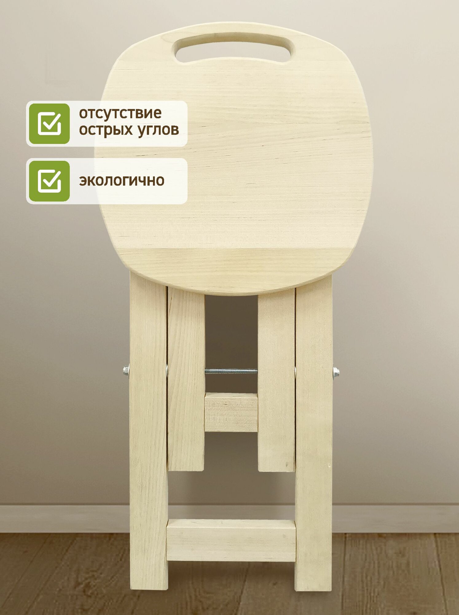 Табурет станет находкой для небольшой кухни, узкой лоджии, балкона. Компактная модель легко раскладывается и отлично справляется с основной функцией: служит удобным местом для сидения. Помимо этого, изделие можно использовать как прикроватный или придиванный столик, подставку для ног, скамеечку для переобувания. Складная конструкция – еще один очевидный плюс: в сложенном виде табурет поместится в кухонном пенале, стенной нише, на шкафу. Удобно и транспортировать его в багажнике автомобиля на дачу или пикник на природе. Сиденье и опоры изготовлены из массива сосны: дерево только отшлифовано и ничем не покрыто, что оценят поклонники экостиля в интерьере.
