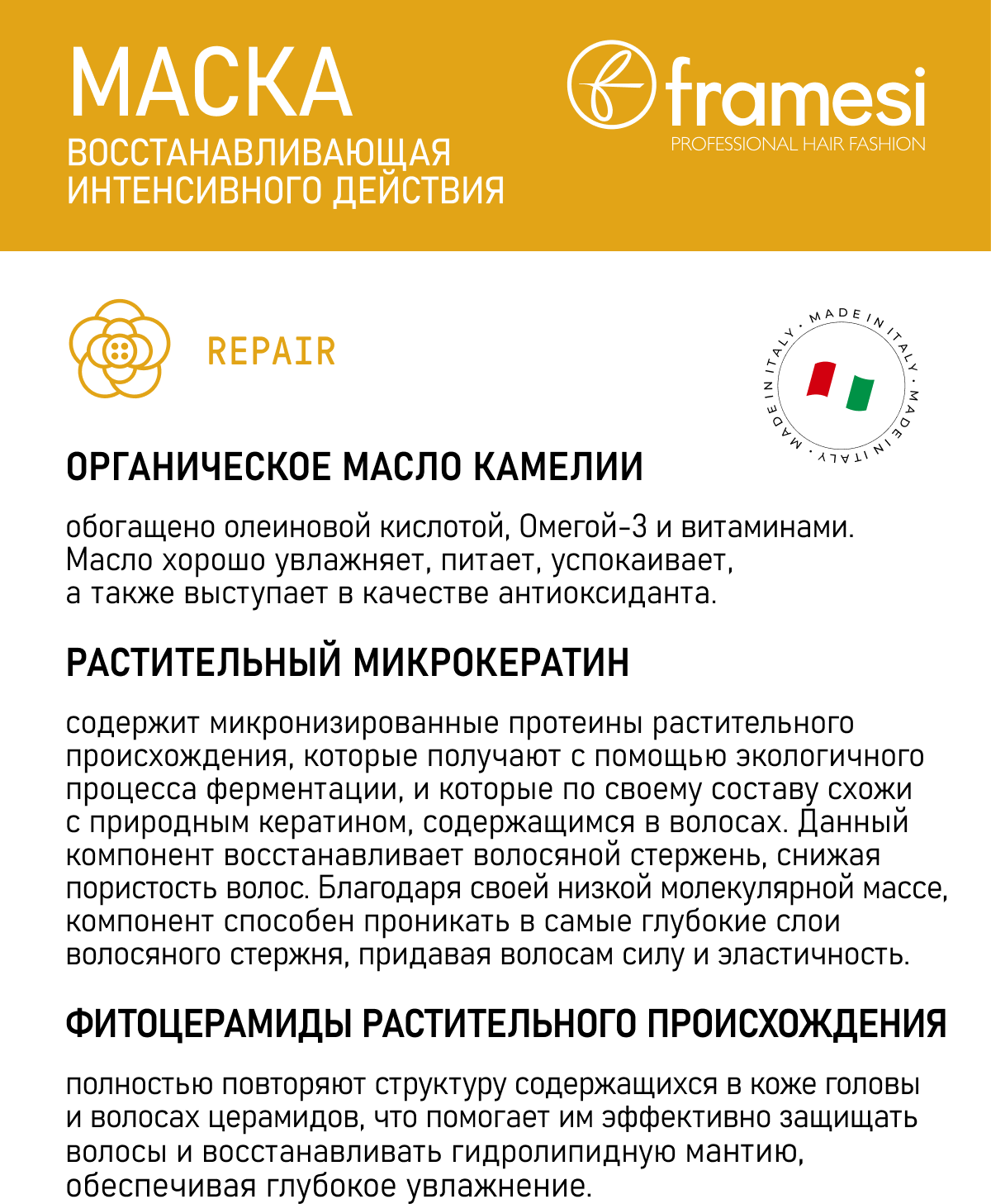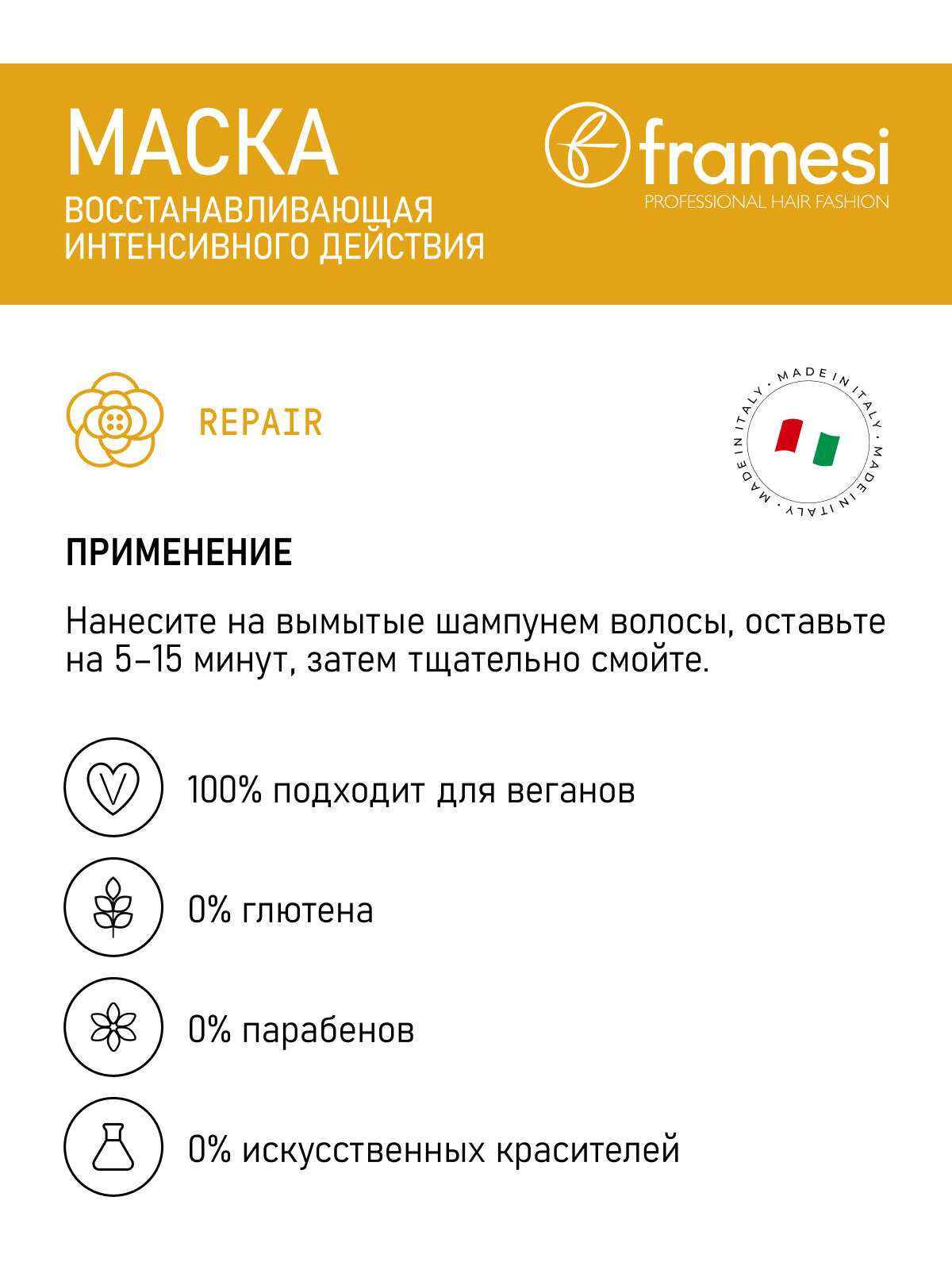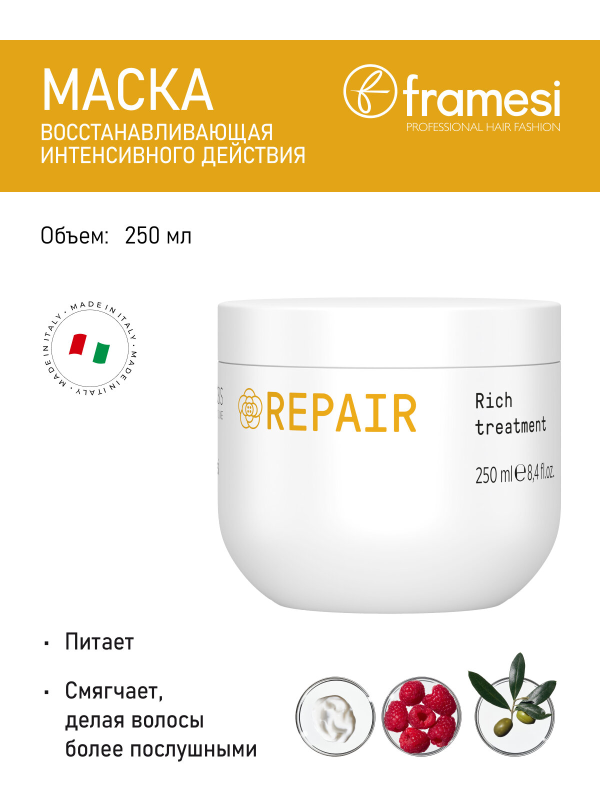 На сегодняшний день товар «Восстанавливающая маска интенсивного действия Repair Rich Treatment 250 мл Framesi (ЭХ99989436102)» можно купить с кешбеком в 1 магазине: Яндекс.Маркет