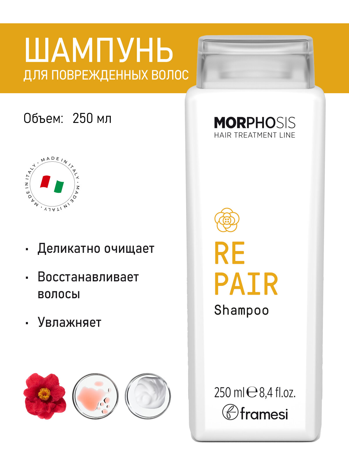Шампунь восстанавливающий для поврежденных волос REPAIR SHAMPOO обогащен маслом камелии, гидролизованным растительным микрокератином и фитоцерамидами. Средство восстанавливает волосы изнутри, делает их более прочными и заметно увлажненными. Органическое масло камелии, входящее в состав средств линии Morphosis Repair, обогащено олеиновой кислотой, омегой-3 и витаминами. Масло часто используется в косметических средствах, так как оно хорошо увлажняет, питает, успокаивает, а также выступает в качестве антиоксиданта. Растительный микрокератин содержит микронизированные протеины растительного происхождения, которые получают с помощью экологичного процесса ферментации, и которые по своему составу схожи с природным кератином, содержащимся в волосах. Данный компонент восстанавливает волосяной стержень, снижая пористость волос. Благодаря своей низкой молекулярной массе, компонент способен проникать в самые глубокие слои волосяного стержня, придавая волосам силу и эластичность. Фитоцерамиды растительного происхождения полностью повторяют структуру содержащихся в коже головы и волосах церамидов, что помогает им эффективно защищать волосы и восстанавливать гидролипидную мантию, обеспечивая глубокое увлажнение. Нанесите на мокрые волосы и слегка помассируйте. Тщательно смойте.