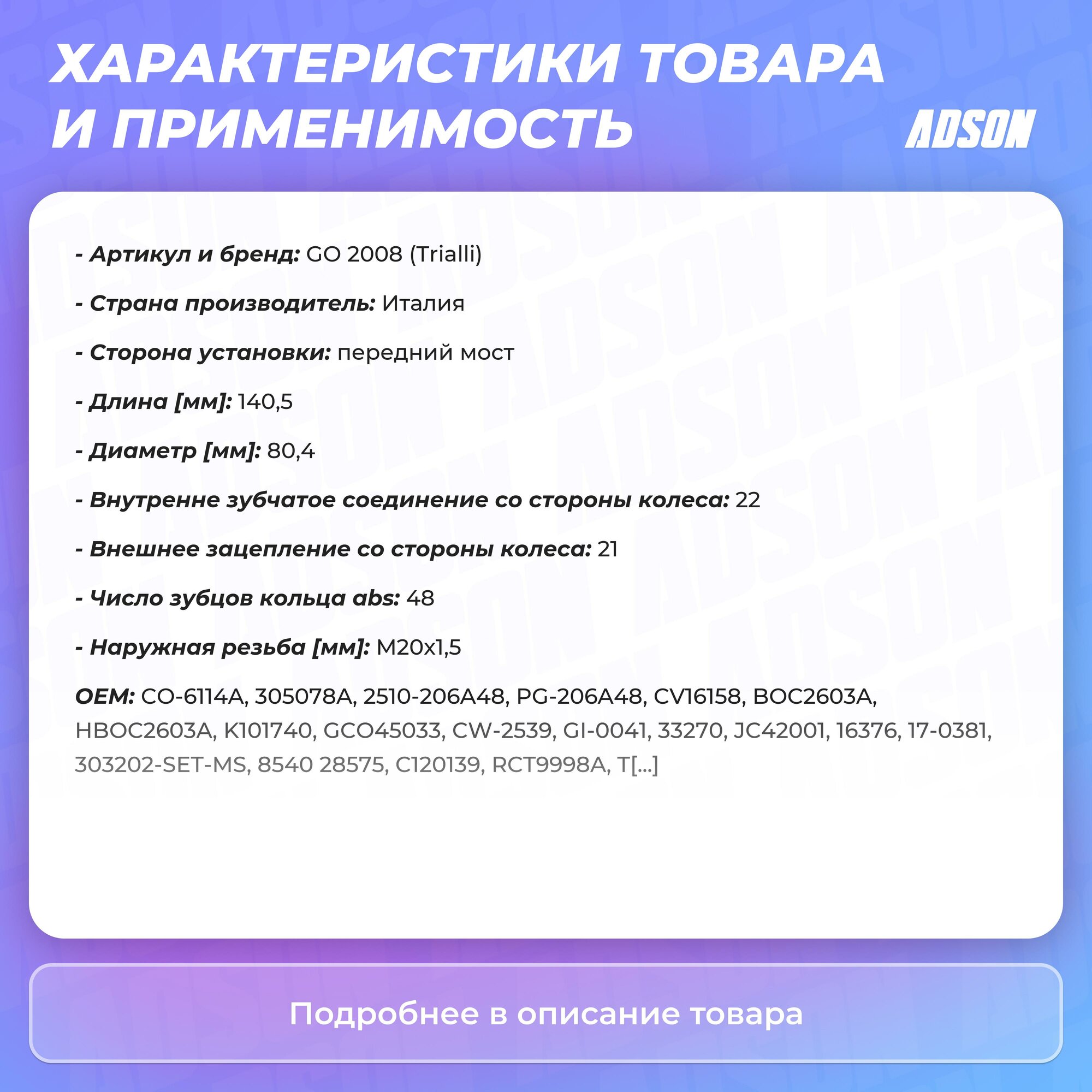 | Сопутствующий товар | ШРУСы:GO 2010, GO 2009 |