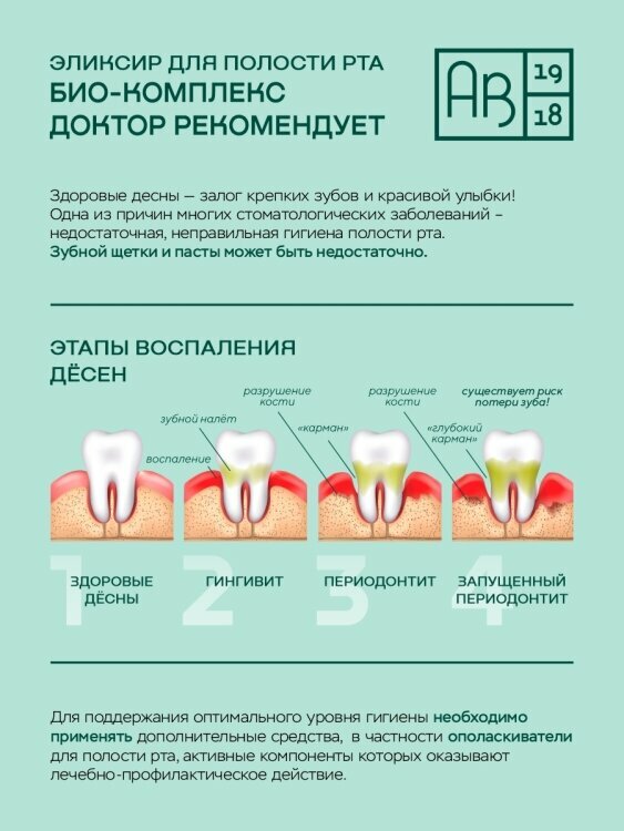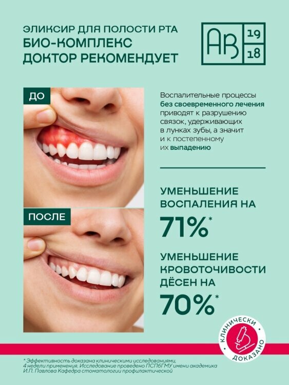Эффективность Эликсира для полости рта БИОКОМПЛЕКС серии ДОКТОР РЕКОМЕНДУЕТ доказана клинико-лабораторными исследованиями применения средства в течение месяца в ПСПб ГМУ им. академика И. П. Павлова на кафедре профилактической стоматологии. Эликсир показал следующие результаты: очищающий эффект по индексу Грина — Вермиллиона (уменьшение зубного налёта) — 56,18 %; противовоспалительная эффективность по индексу РМА — 71,20 %; кровеостанавливающая эффективность по индексу кровоточивости — 70,05 %; дезодорирующая эффективность эликсира — 56,14 %; противокариесная эффективность по методу ЭОМ — 40,00 %; реминерализующая эффективность, определяемая с помощью ТЭР-теста, — 33,33 %. исследуемый Эликсир для полости рта обладает антимикробной активностью в отношении S. Mutans. Эликсир для полости рта БИО-КОМПЛЕКС серии ДОКТОР РЕКОМЕНДУЕТ АВ1918 предназначен для профилактики заболеваний полости рта. Оказывает выраженное воздействие на проблемы десен, вызванные гингивитом и пародонтитом, а также практически полностью устраняет неприятные запахи изо рта. Установлено, что эликсир для полости рта БИО-КОМПЛЕКС серии ДОКТОР РЕКОМЕНДУЕТ обладает профилактическими свойствами, которые выражаются в его очищающем, противовоспалительном, кровеостанавливающем, дезодорирующем, противокариесном, реминерализующем действии, обладает антимикробной активностью в отношении S. Mutans. Эликсир для полости рта БИО-КОМПЛЕКС изготовлен на основе арктических водорослей. Активные компоненты: Экстракт ламинарии — эффективно улучшает состояние слизистой полости рта, уменьшает покраснения и рыхлость дёсен. Укрепляет ткани пародонта. Минеральный концентрат ламинарии — способствует уплотнению и реминерализации эмали зубов, профилактике развития кариеса. Настойка мяты перечной — имеет антибактериальные свойства, обеспечивает свежее дыхание. Хлоргексидин – подавляет рост бактерий, обеспечивает профилактику осложнений после стоматологических вмешательств и защищает проблемные дёсны. Состав: вода очищенная, экстракт ламинарии, мяты перечной настойка, витамин С, концентрат минеральный ламинарии, хлоргексидин, консервант. Информация о применении: 1колпачок эликсира (5 мл) развести в 1/4 (50 мл) стакана тёплой воды. Полоскать рот в течение 1–2 минут 1–2 раза в день.