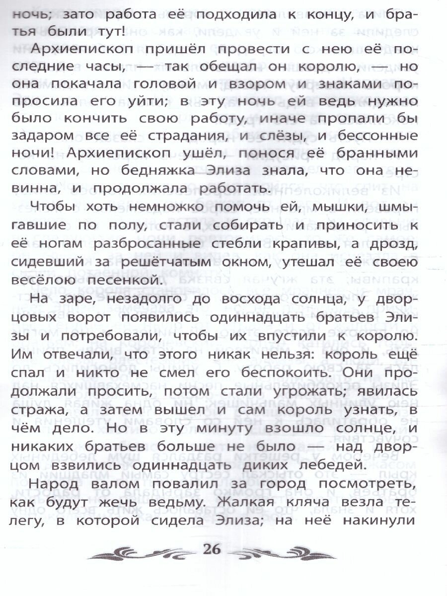 Купив любимые сказки Г.Х.Андерсена изд. Феникс была немного огорчена качеством бумаги (страницы тонкие, просвечивают, что затрудняет чтение и портит зрение ребенку). Шрифт оказался средним. В содержании три сказки: Дикие лебеди, Огниво, Русалочка. Отсутствие иллюстраций никак не повлияли на чтение и заинтересованность мой дочери.