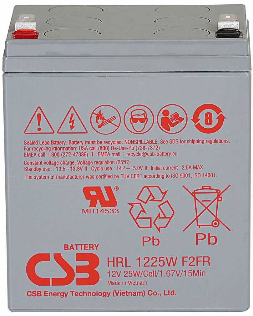 Свинцово-кислотные аккумуляторы обладают увеличенным сроком службы. Предназначены для резервного питания промышленного оборудования, используются в источниках бесперебойного питания (UPS) и резервного освещения, охранных и пожарных систем, в составе оборудование электросвязи, аварийного освещения, телеметрического оборудования, портативной измерительной аппаратуры, электроинструмента, газонокосилок, вакуумных очистителей, контрольного и другого оборудования при необходимости длительного использования источников питания.. CSB GPL1272 - аккумуляторная батарея, специально рассчитанная на циклы глубокой разрядки, герметизированная необслуживаемая батарея для источников бесперебойного питания (UPS), подходит и для систем резервного освещения на электростанциях и подстанциях, как источник питания в портативном измерительном оборудовании, электроинструментах и многих других технических решениях.