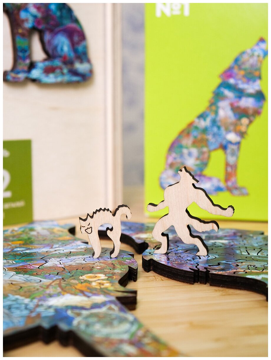 На картине с темным волком сгущается тьма и проступают темные силы - оборотни, опасные злобные персонажи, замок вампиров, ночная охота. Герои темной стороны выходят и обретают форму и объем в деревянных деталях пазла.