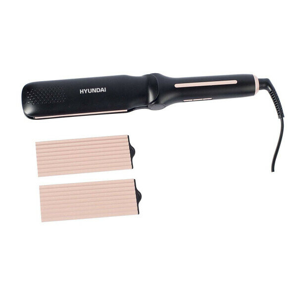 В комплекте с Hyundai H-HM1550 поставляются сменные рельефные насадки, позволяющие придать волосам оригинальную волнистую фактуру. И они, и базовые гладкие пластины выполнены из смеси керамики и турмалина. Оба материала нагреваются равномерно по всей площади и отличаются бережным отношением к любым типам волос. Также турмалин обладает свойством ионизации. Эти мелкие частицы, имеющие отрицательный заряд, делают шевелюру более податливой для завивок, укладок и выпрямления, а также придают ей здоровый и блестящий вид.