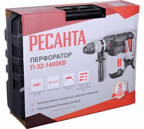 | Прочие особенности и свойства | Электрический перфоратор Ресанта П-40-1600КМ мощностью 1600 Вт используется при капитальном ремонте и строительстве. Наличие двух режимов: удара и сверления с ударом позволяет создавать отверстия в бетоне, кирпичной кладке и каменной породе, а также совершать ударную работу подобно отбойному молотку. Максимальная скорость вращений 620 об/мин позволяет создавать в бетоне отверстия диаметром до 40 мм. Благодаря функции ее регулировки можно контролировать интенсивность работы. Частота ударов 0-3750 уд/мин с максимальной силой 11,3 Дж дает возможность обрабатывать твердые поверхности., , Мощный профессиональный перфоратор Ресанта П-40-1600КМ имеет вертикальное расположение двигателя и оснащен креплением сверла в патроне типа SDS-MAX. Это позволяет использовать хвостовики диаметром 18 мм. Дополнительная рукоятка обеспечивает более надежный хват и позволяет приложить к инструменту больше усилий при сверлении твердых материалов. Благодаря настройке углового положения инструмент может использоваться в сложных труднодоступных местах. Четырёхметровый кабель обеспечивает удобство в работе. Профессиональный инструмент имеет вес 7,2 кг. Антивибрационная система в сочетании с прорезиненной рукояткой снижает негативное воздействие на пользователя. Виброзащита облегчает процесс работы и увеличивает срок эксплуатации инструмента. Удобный пластиковый кейс обеспечивает безопасное хранение прибора и оснастки., Гарантия 5 лет подтверждает высокое качество инструмента, Блокировка кнопки включения, Антивибрационная система (АВТ), Прорезиненный ударопрочный корпус, Рукоять с мягкой накладкой для надежного хвата, Система защиты рабочего механизма от попадания пыли, Дополнительная рукоятка для лучшего контроля над инструментом, Наличие регулируемого ограничителя глубины сверления, Вентиляционные отверстия на корпусе охлаждают двигатель, предохраняя от перегрева, Благодаря функции долбления перфоратор отлично подойдет для прокладки кабель-каналов и удаления кафельной плитки, Пластмассовый кейс для удобства хранения и транспортировки Электрический перфоратор Ресанта П-40-1600КМ |