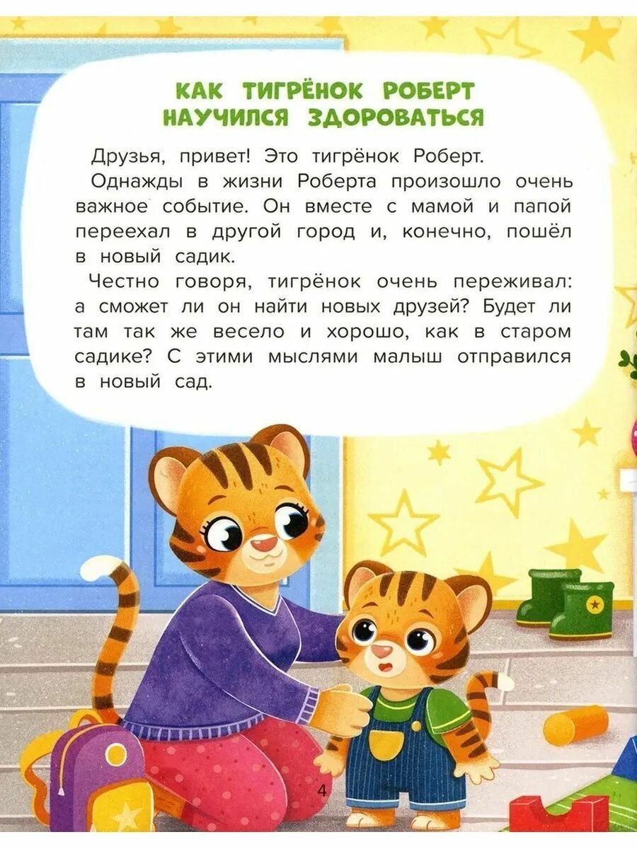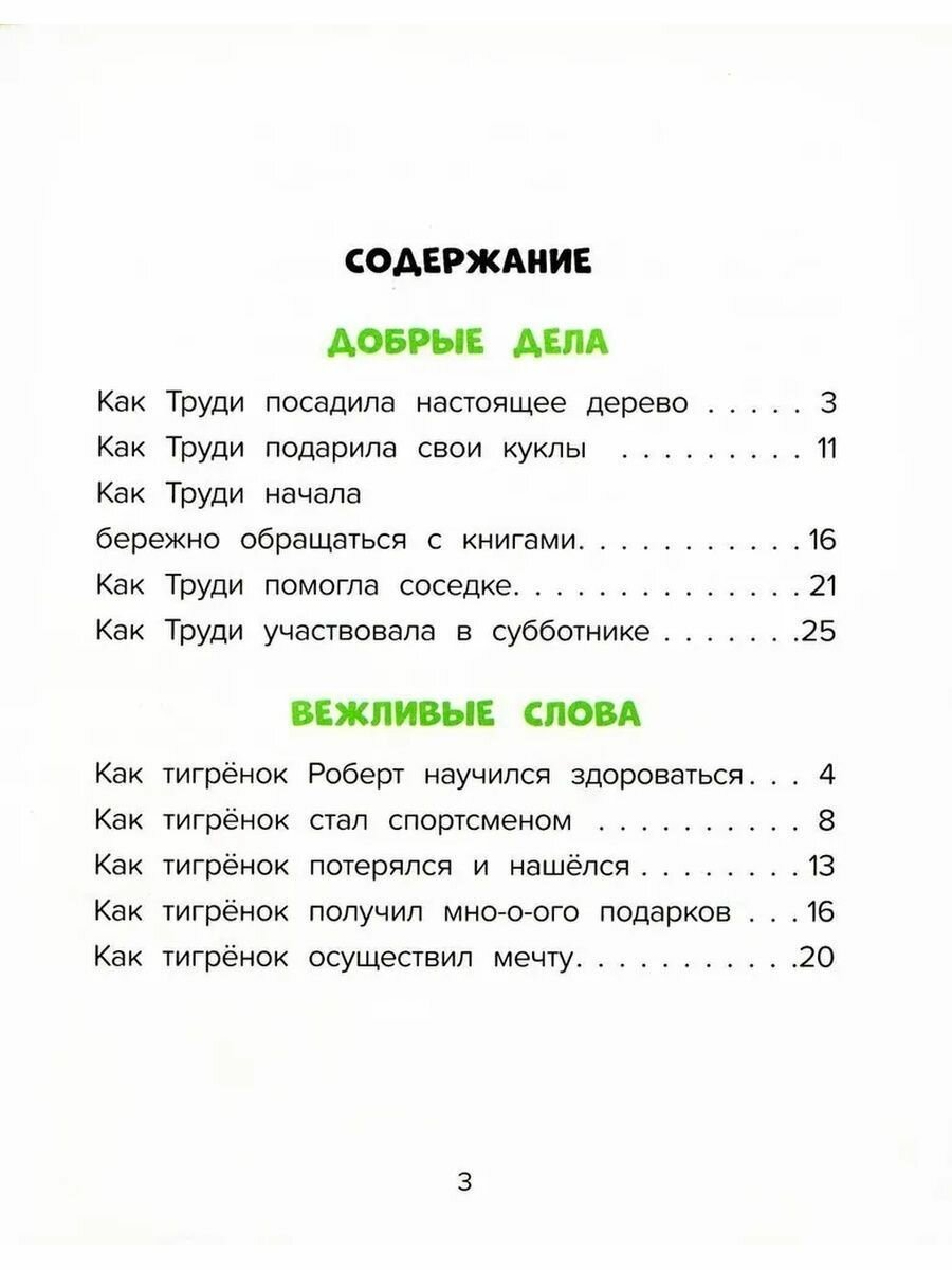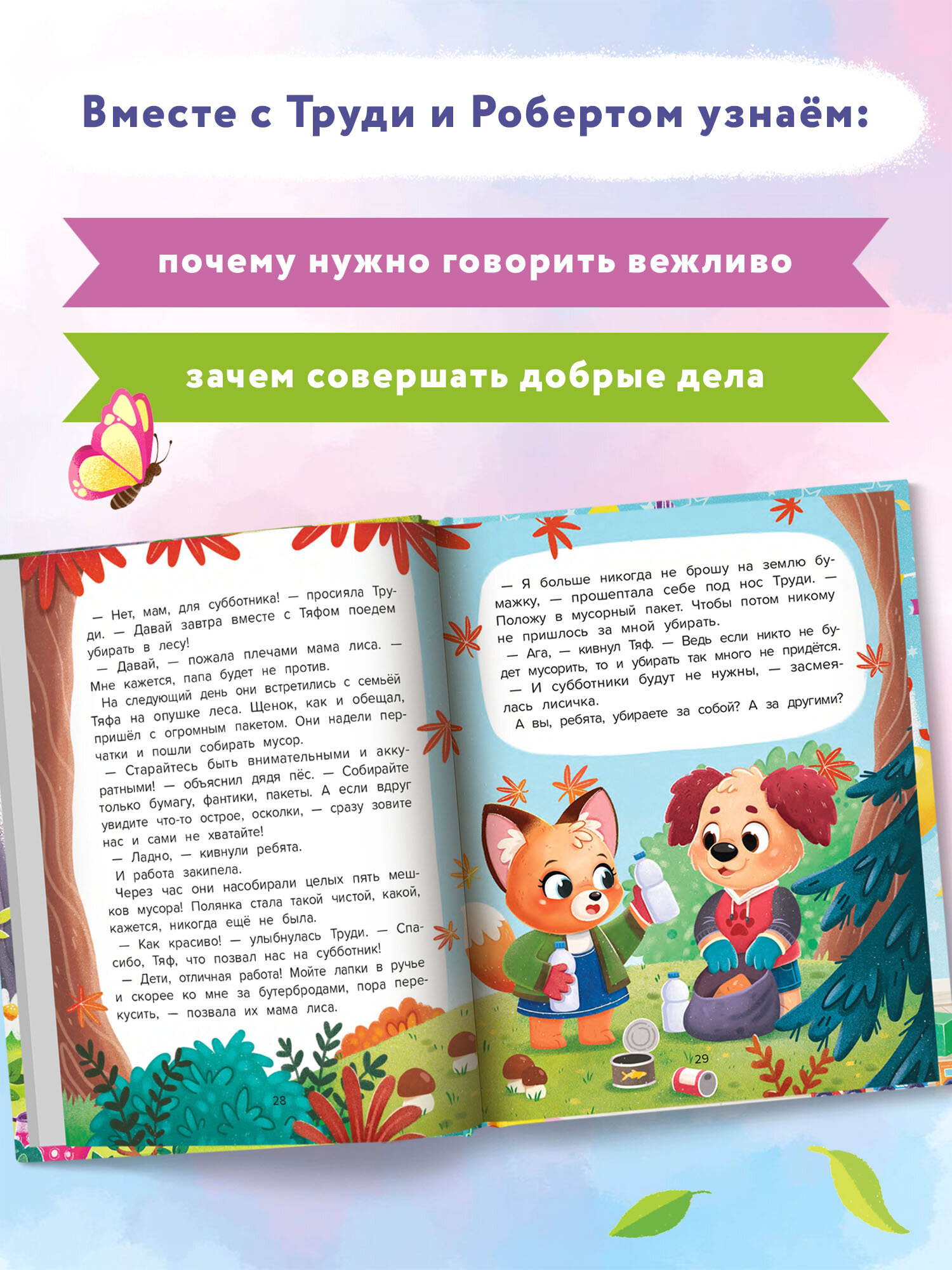 В книге "Добрые дела. Вежливые слова" малыш будет вместе с лисичкой Труди учиться делать добрые дела, а перевернув книгу, познакомится с тигрёнком Робертом и на его примере узнает о важности вежливых слов.