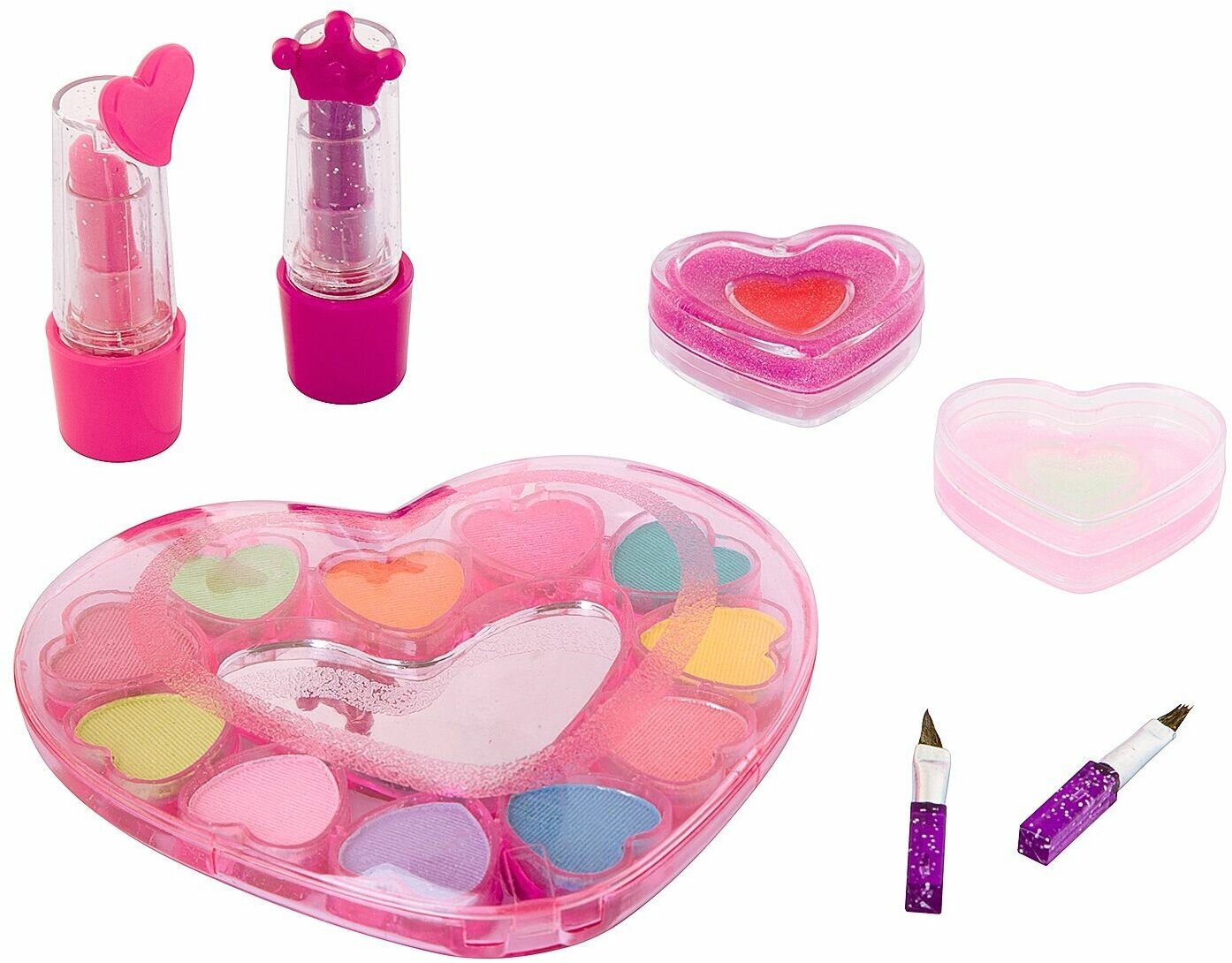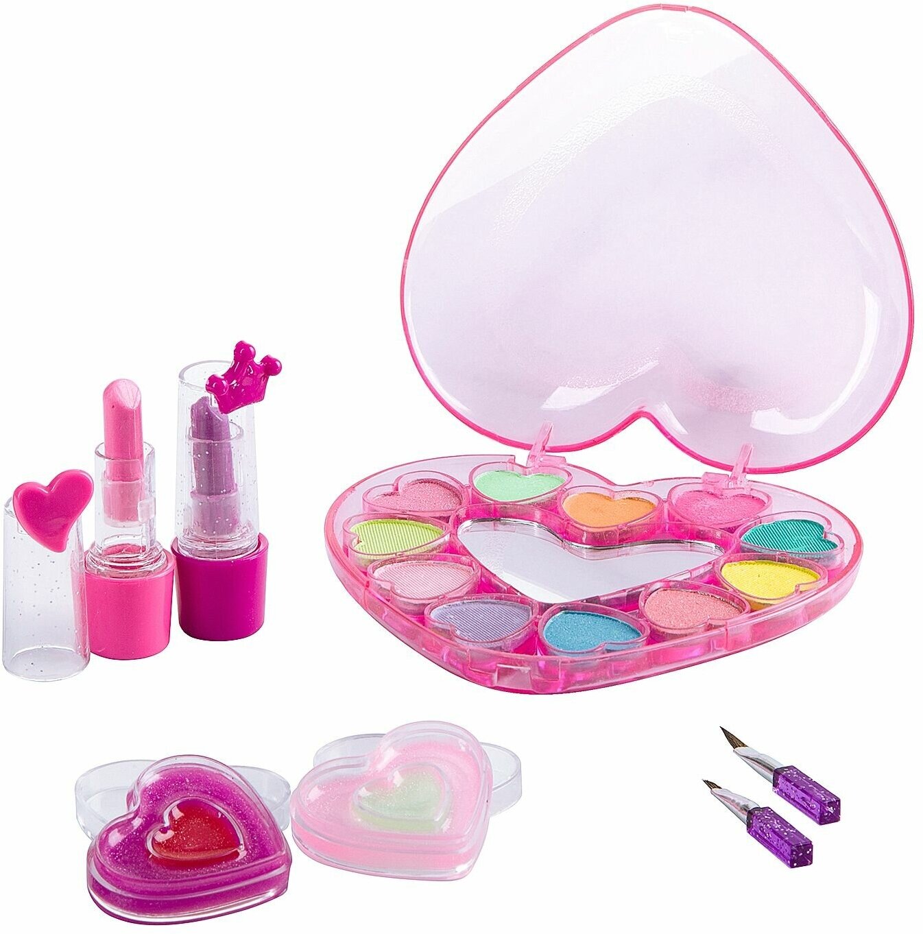 В наборе: помада 2 оттенка (2,4г), 2 кисточки, 2 сердца-футляра с блеском для губ 4 оттенка (3,2г); косметичка-сердце с тенями для век 11 оттенков (7,7г) с зеркальцем.