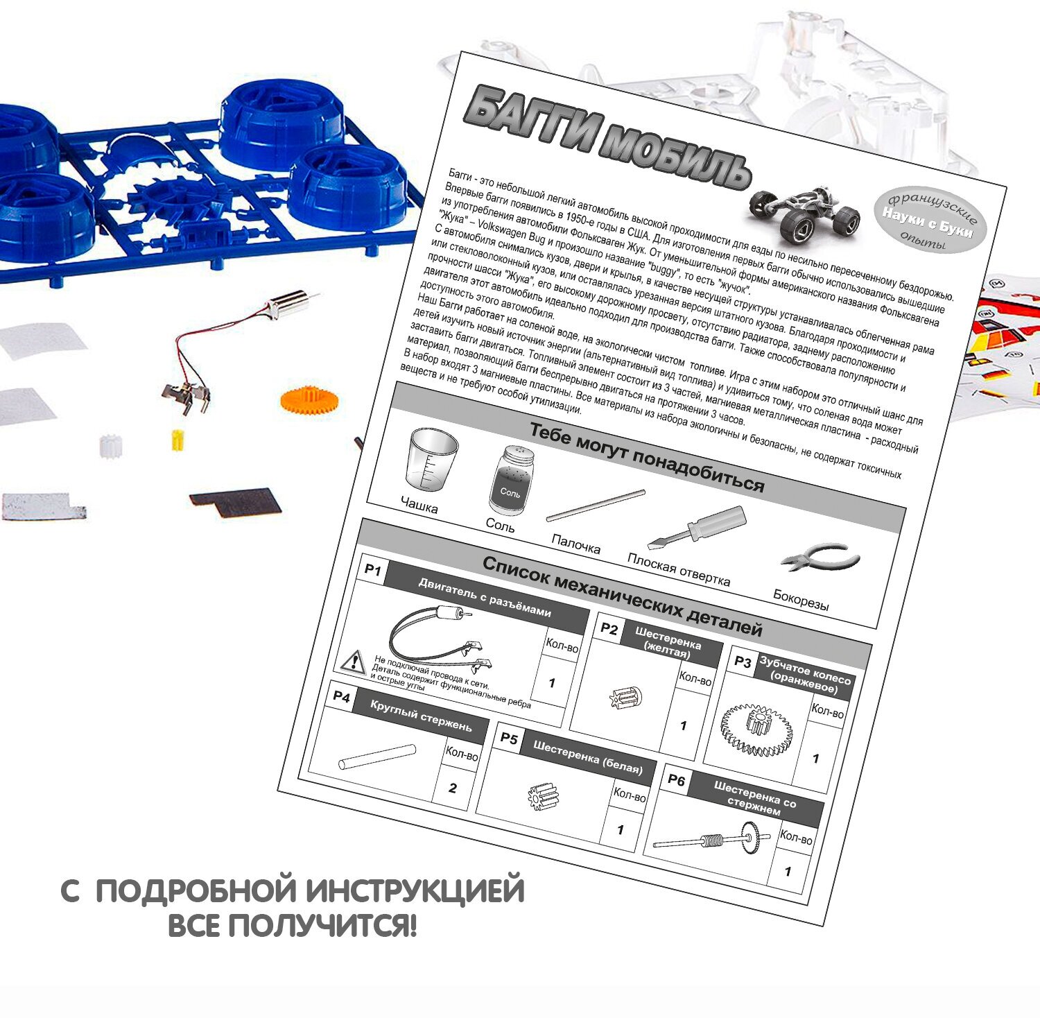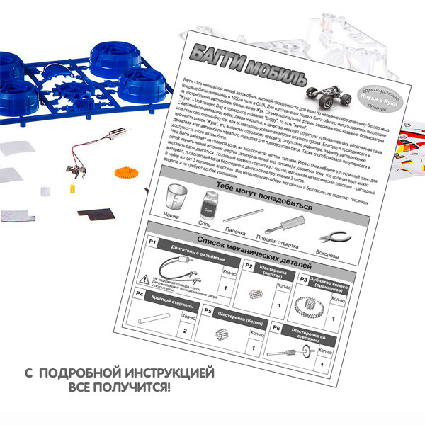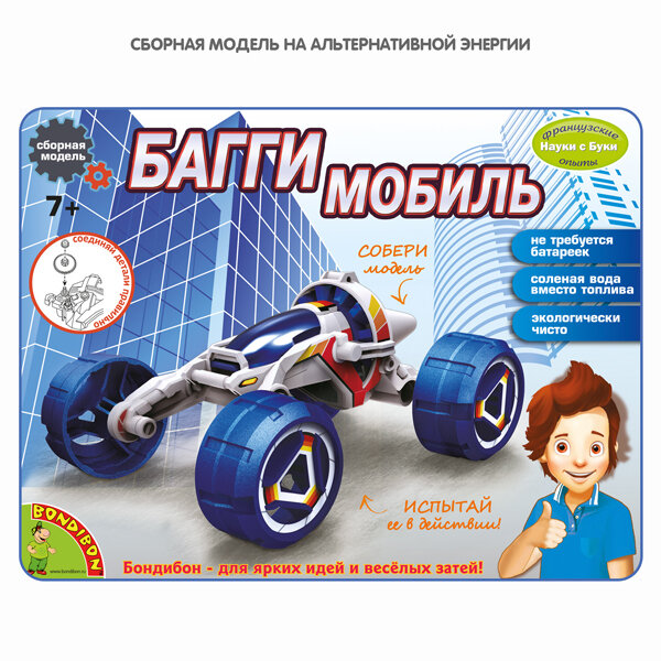 Багги - это небольшой легкий автомобиль высокой проходимости для езды по бездорожью. Впервые они появились в 1950-е годы в США, а называться так стали от уменьшительной формы американского названия Фольксвагена "Жука" - Volkswagen Bug. Наш сборный баги тоже может покорять бездорожье, а топливом ему служит не бензин, а солёная вода. Собирая данный набор, ребёнок познакомится с альтернативными источниками энергии и устройством двигателя.