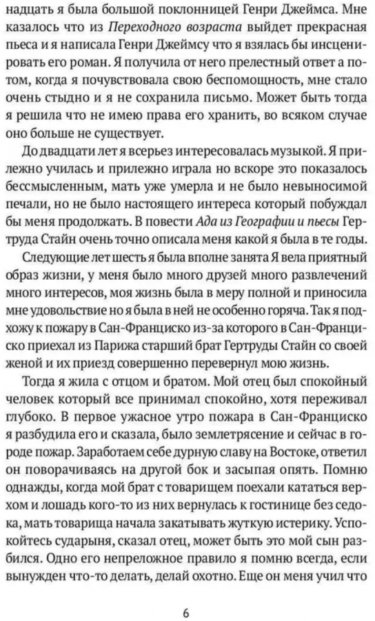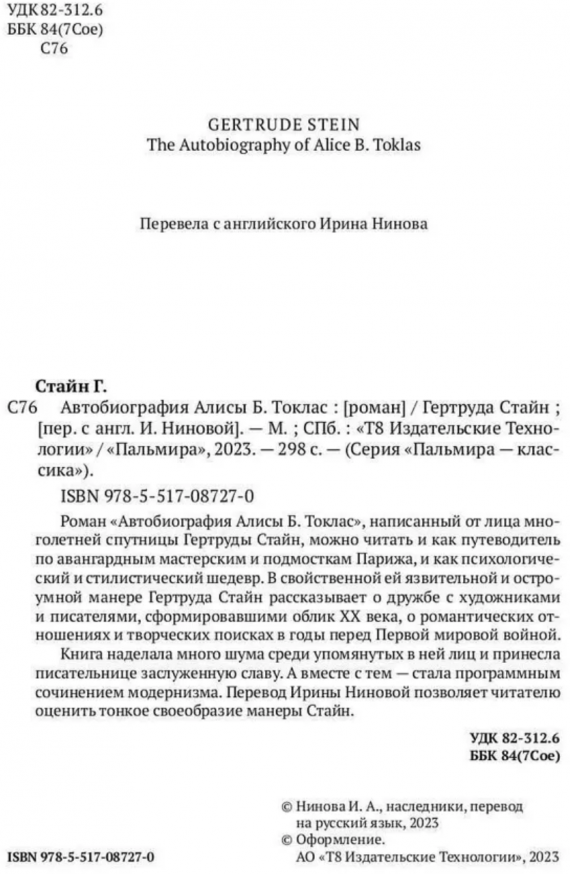 Гертруда Стайн (1874-1946) - писательница и теоретик литературы, оставившая след в модернистской литературе не только как автор, но и как организатор кружка для молодых англоязычных писателей. Подруга Хемингуэя, Пикассо и каждой мало-мальски значимой личности Парижа начала XX века. Роман "Автобиография Алисы Б. Токлас", написанный от лица многолетней спутницы Гертруды Стайн, можно читать и как путеводитель по авангардным мастерским и подмосткам Парижа, и как психологический и стилистический шедевр. В свойственной ей язвительной и остроумной манере Гертруда Стайн рассказывает о дружбе с художниками и писателями, сформировавшими облик XX века, романтических отношениях и творческих поисках в годы перед Первой мировой войной. Книга наделала много шума среди упомянутых в ней лиц и принесла писательнице заслуженную славу. А вместе с тем - стала программным сочинением модернизма. Перевод Ирины Ниновой позволяет читателю оценить тонкое своеобразие манеры Стайн. Было бы не совсем верно полагать, будто Ирина Нинова перевела эту прозу с английского на русский. Она переводила с одного несуществующего языка на другой - небывалый. Само собой, необходимо требовался особенный синтаксический рисунок, тщательно процеженный словарь, и мастерство и вдохновенье. Самуил Лурье
